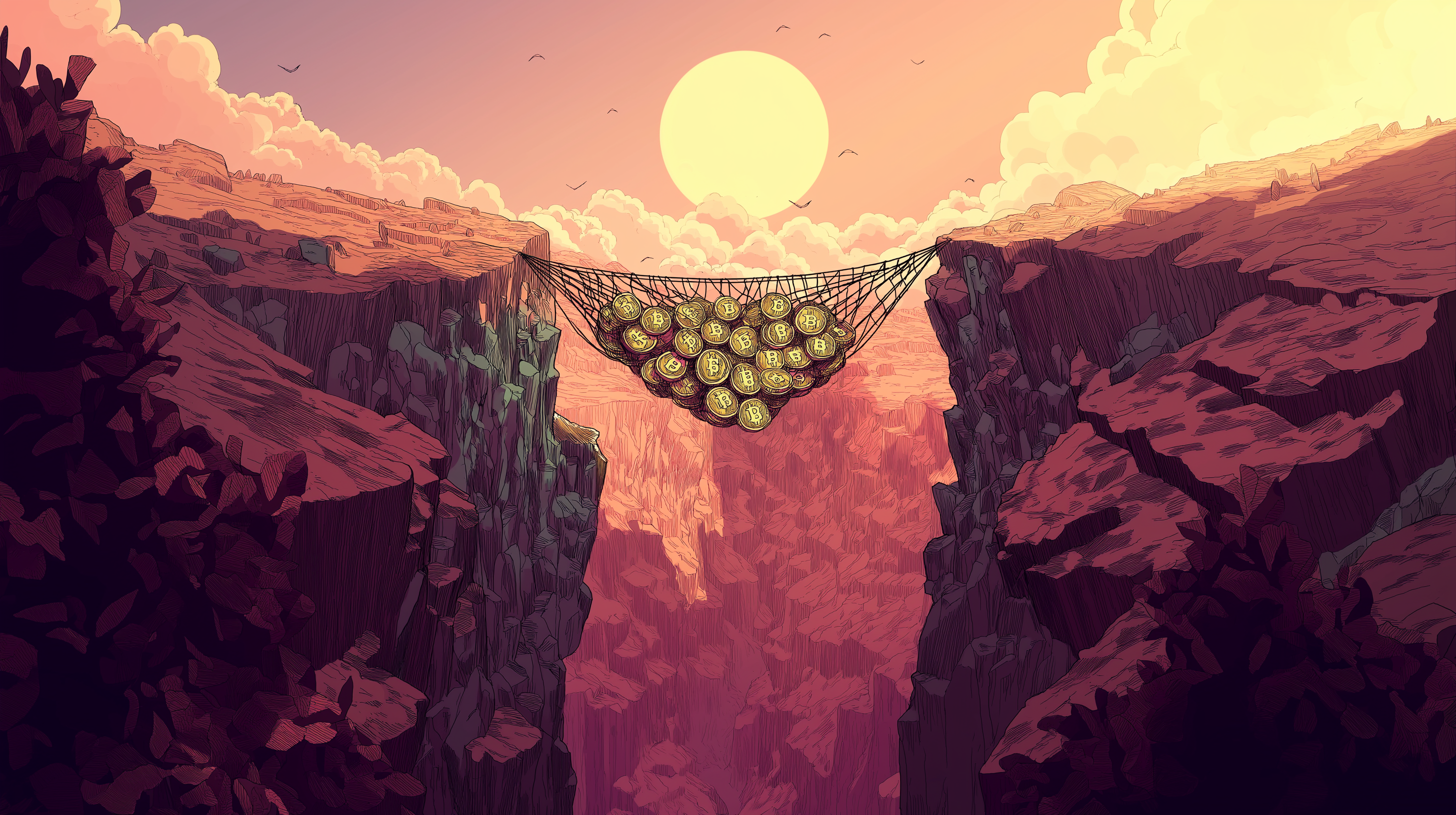 This illustration features a large net brimming with shimmering bitcoin coins, hanging precariously over a vast canyon. The comic style adds a whimsical and adventurous feel, evoking a sense of risk and excitement.