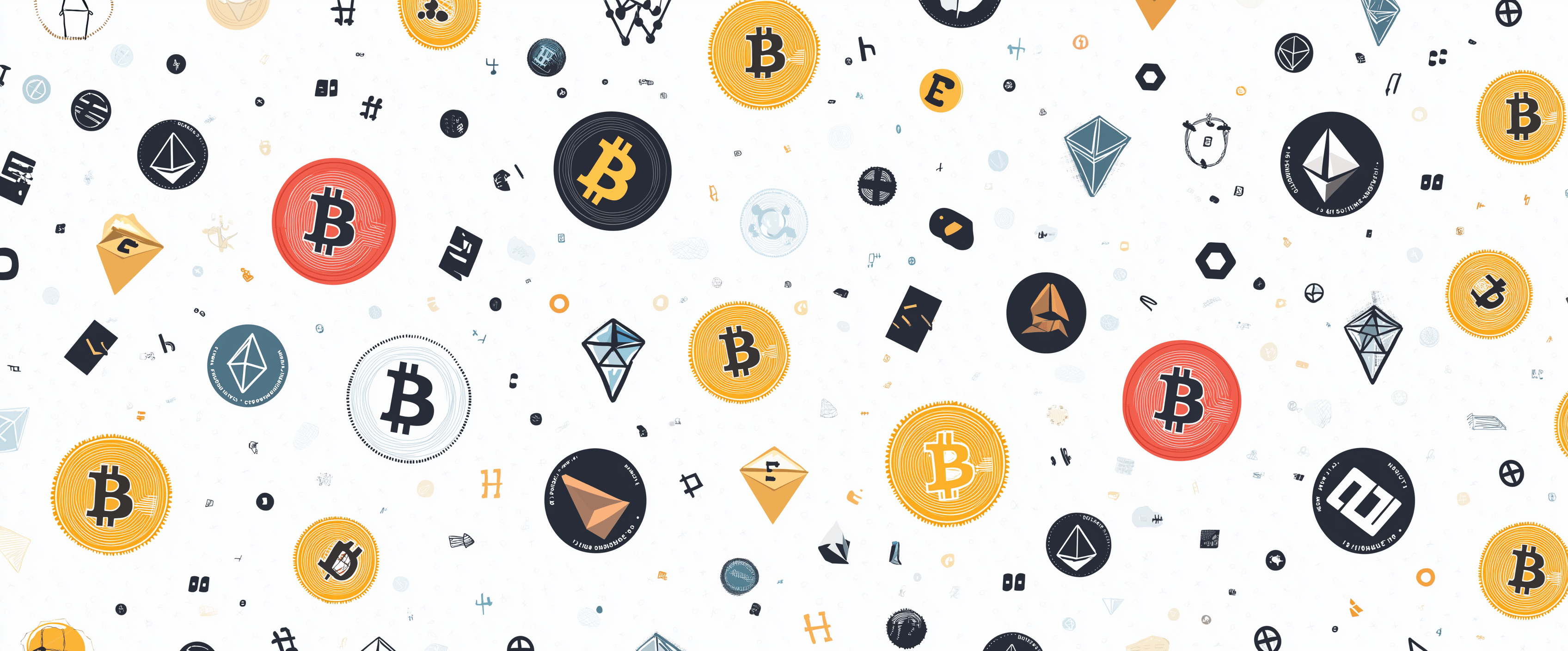 This image showcases a seamless pattern filled with various cryptocurrency icons against a clean white background. The minimal flat design gives it a modern tech aesthetic, creating a visually appealing arrangement.