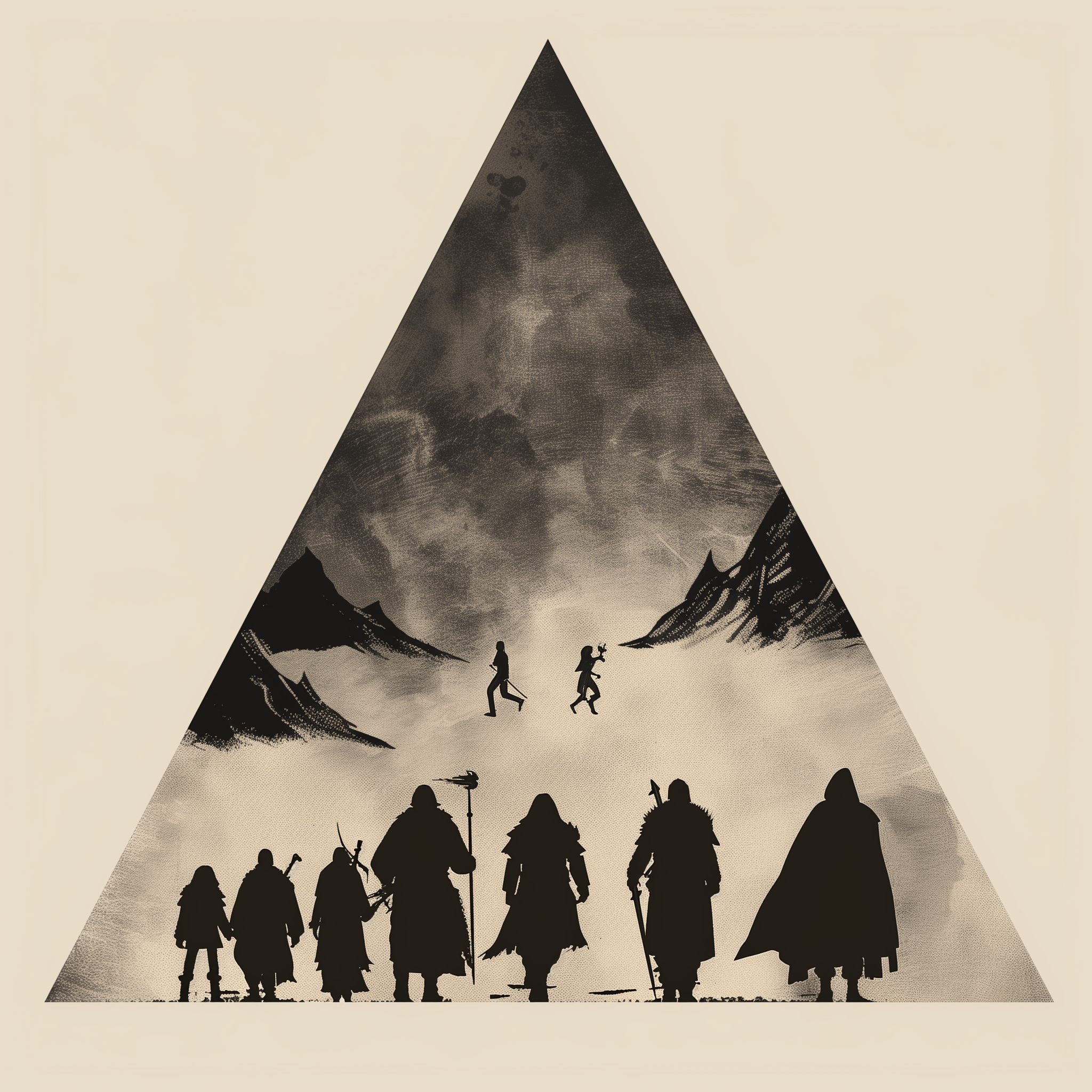A group of sinister Dungeons and Dragons villains marching in a triangular formation on a quest, depicted in a graphic, minimal, and stylized style.