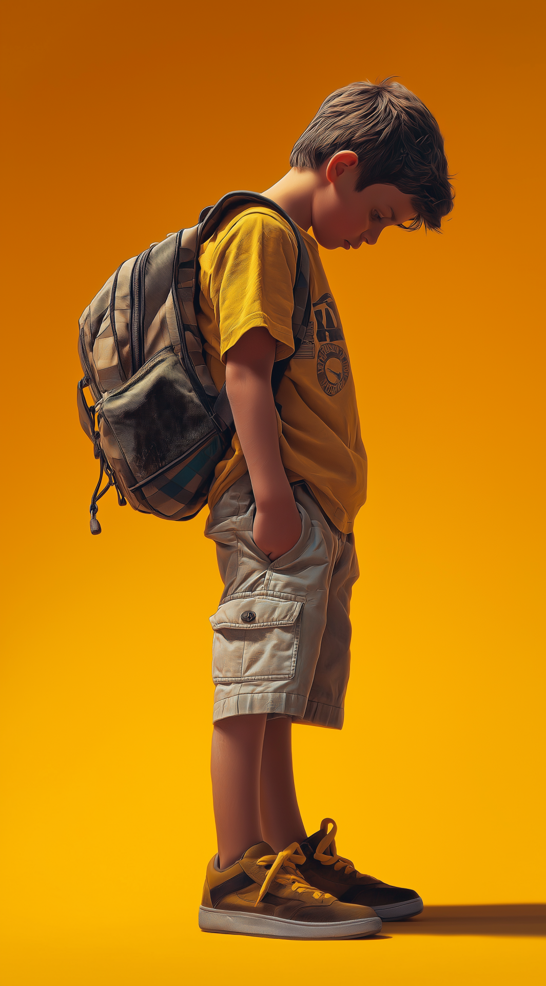 A young boy dressed in shorts stands with his head down, examining his shoes. The image is vibrant and photorealistic, showcasing bright colors and high resolution to capture the essence of childhood curiosity.