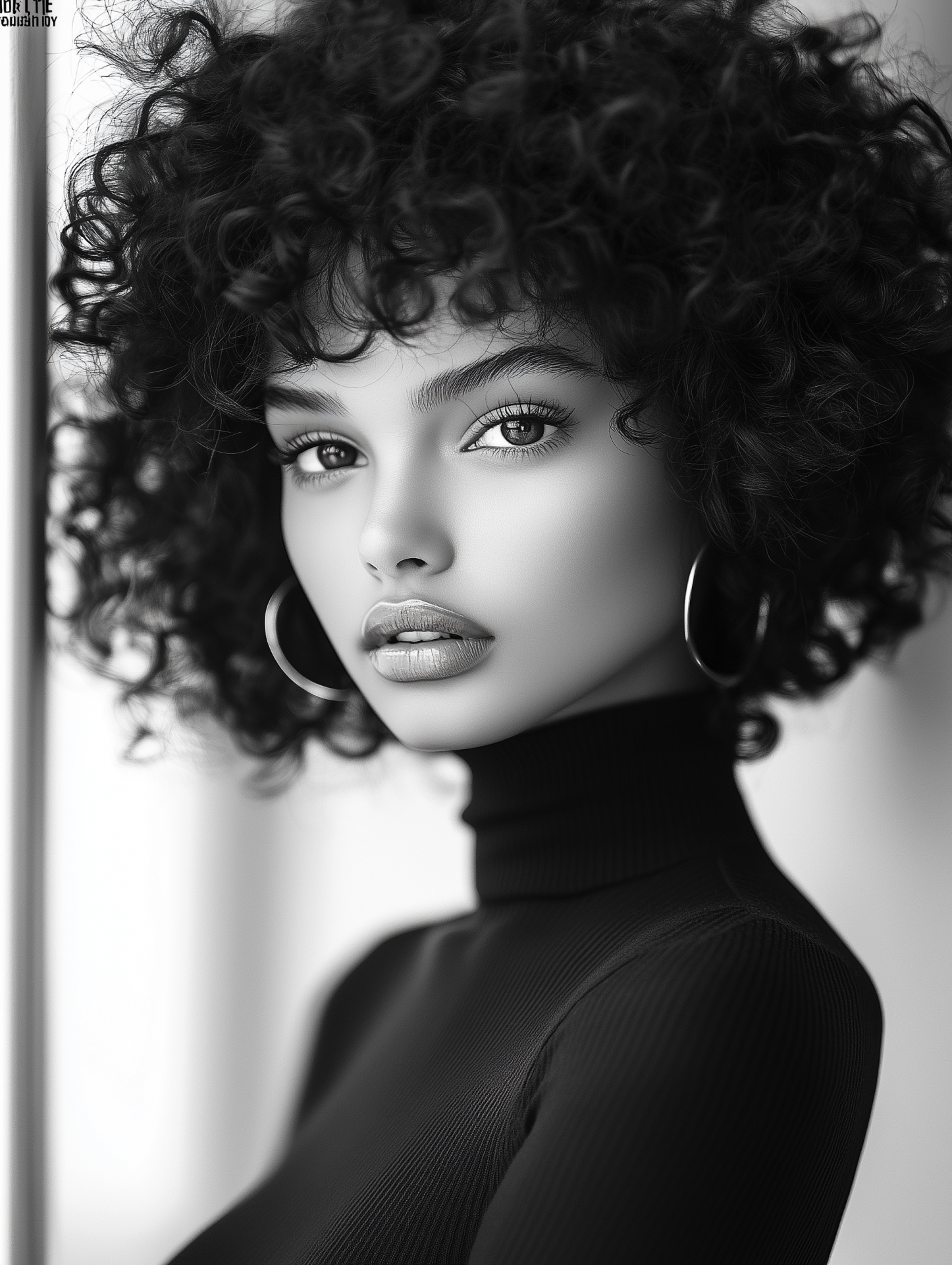This image features a striking black and white portrait of a black woman with curly hair against a plain white background. The contrast between her hair and the backdrop creates a bold and captivating aesthetic.
