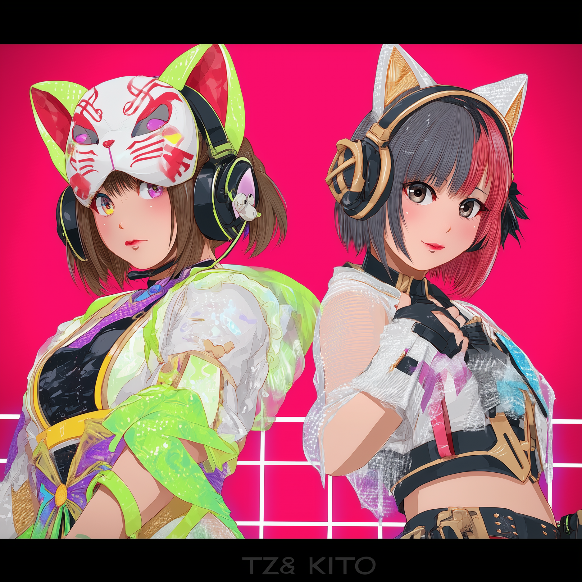 This illustration features two cute anime catgirls with big cat ears. The bright colors and modern anime art style create a cheerful and vibrant atmosphere.