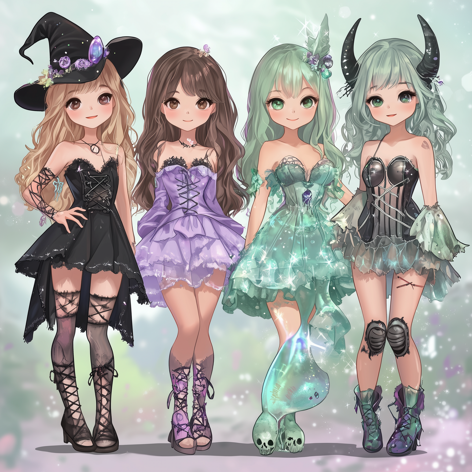A colorful illustration of adorable cartoon girls arranged in cheerful poses. Each girl showcases a whimsical dress that reflects a different playful theme, creating a joyful and vibrant atmosphere.