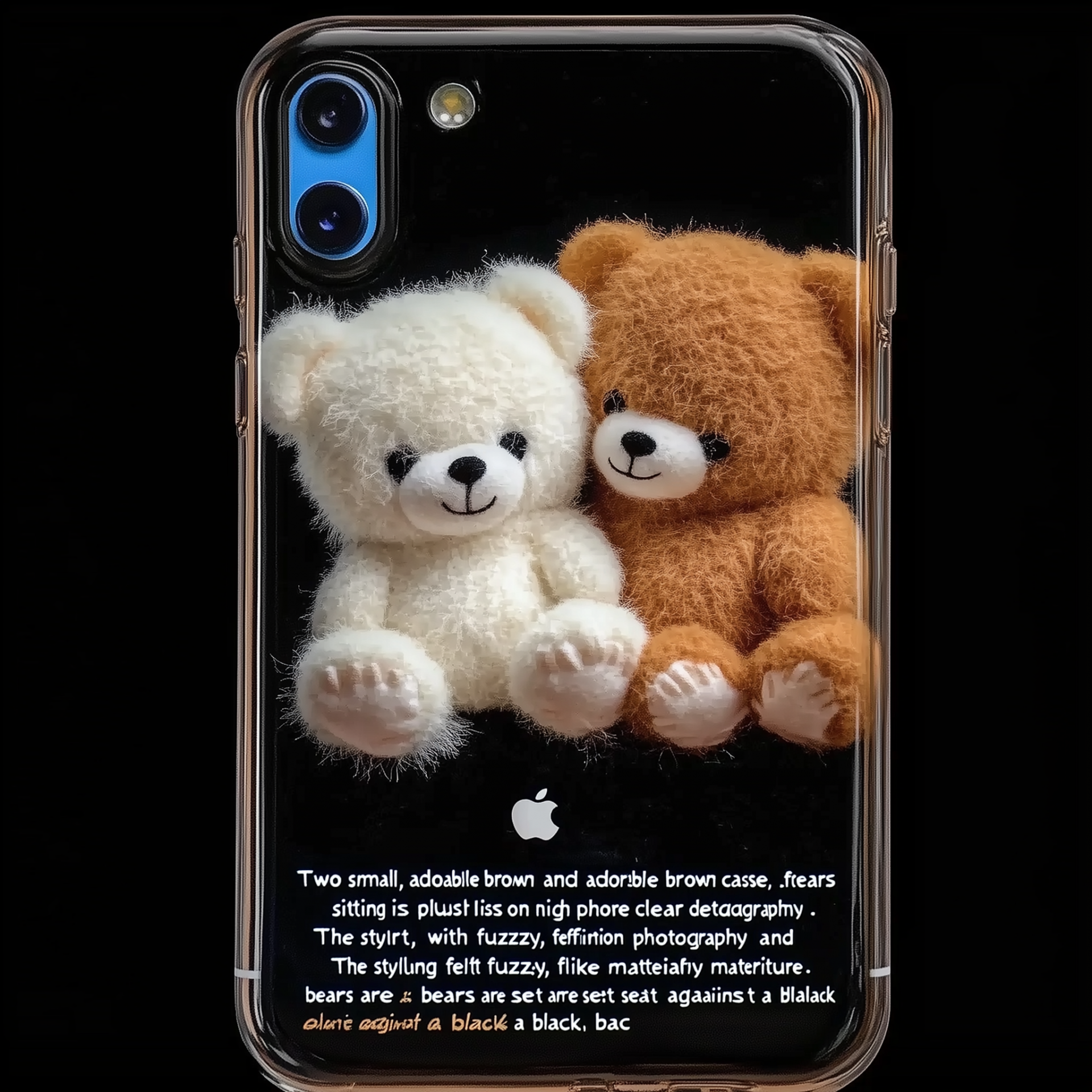 This image features two small, adorable brown and white teddy bears placed on a phone case. The bears are depicted with clear details that highlight their cute expressions and soft textures, creating a heartwarming scene.