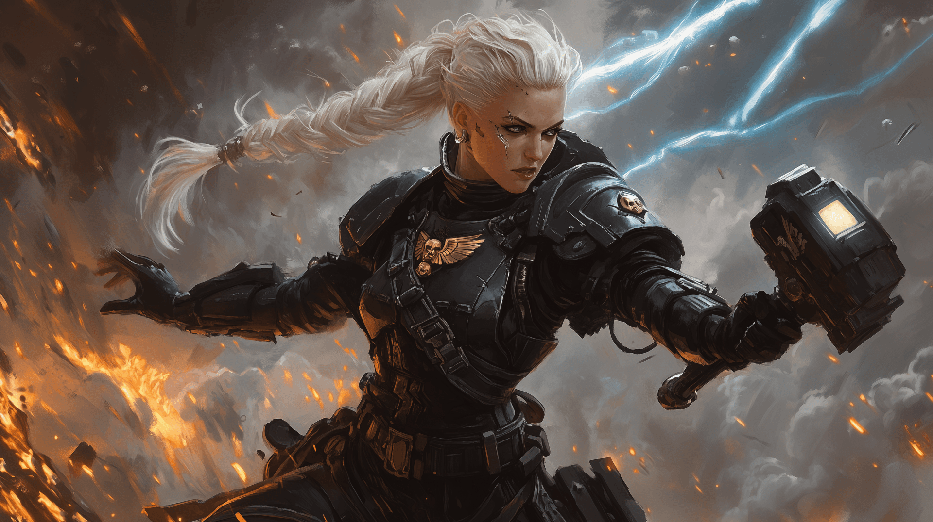 The image features a powerful woman with white hair and a distinctive braid, clad in imposing black armor. She stands heroically on a battlefield, exuding strength and determination, with a cybernetic power hammer adding to her fierce aesthetic.