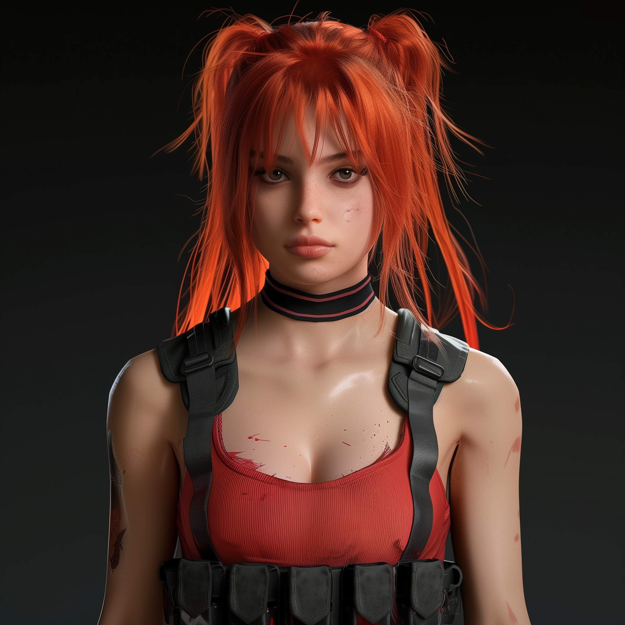 The image features a stunning character design of a girl inspired by a popular video game, styled in a vibrant cyberpunk aesthetic. She wears a striking red top paired with a neon black vest, standing out against a dark background that enhances her dynamic presence.