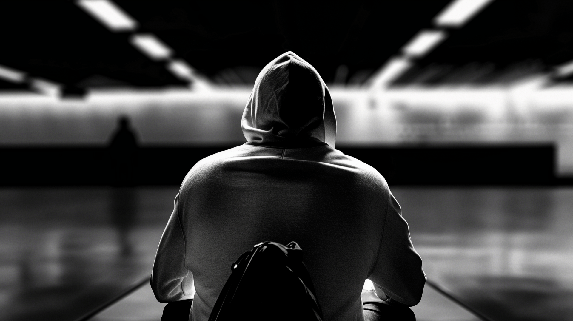 The image portrays a solitary figure of a hacker with their back turned, shrouded in the mystery of a dark room. The hooded sweatshirt adds an air of secrecy, emphasizing isolation and focus.