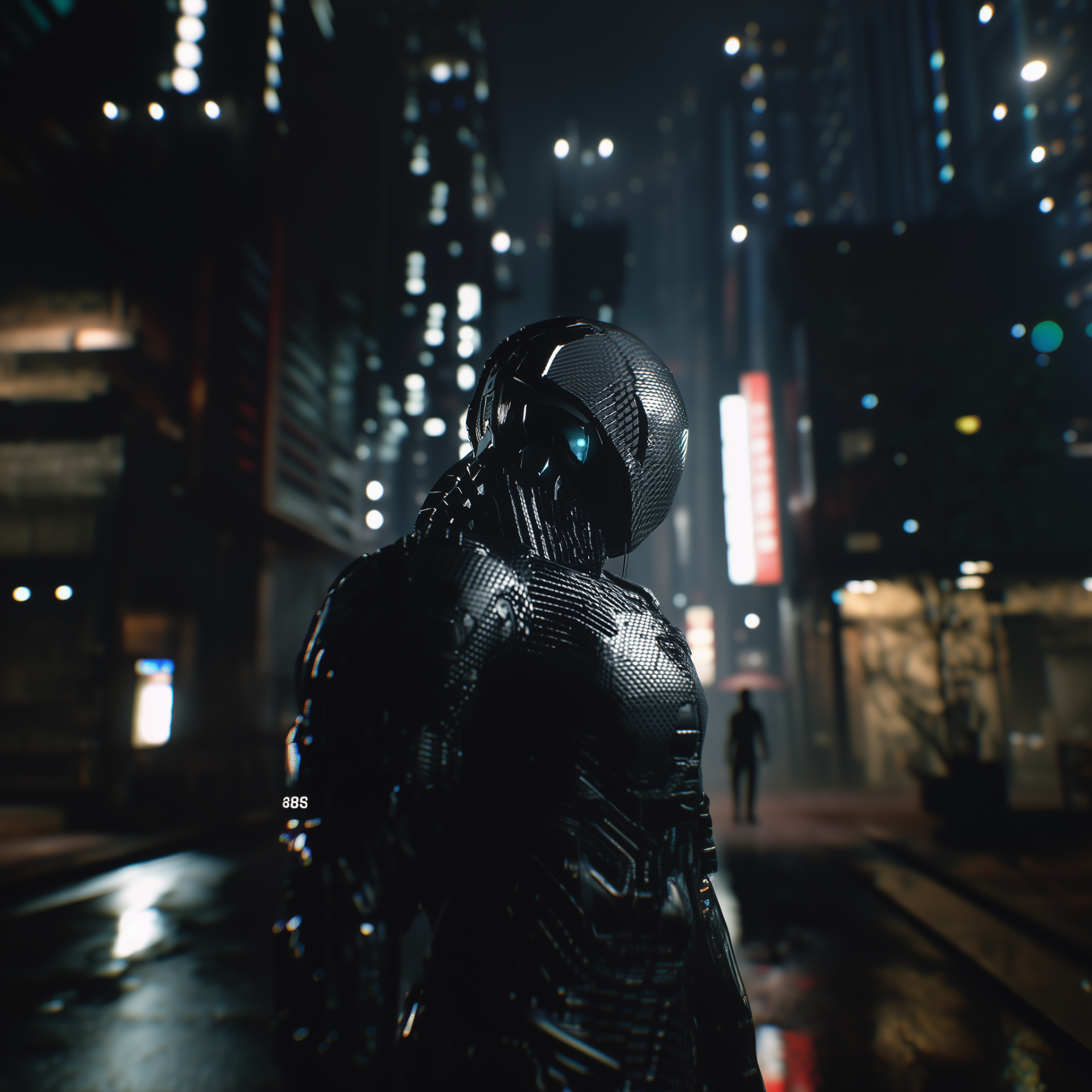 This illustration depicts a powerful humanoid drone with intricate armor and scales, embodying the essence of cyberpunk aesthetics. The image exudes a sense of advanced technology and surrealism, set against a futuristic backdrop.