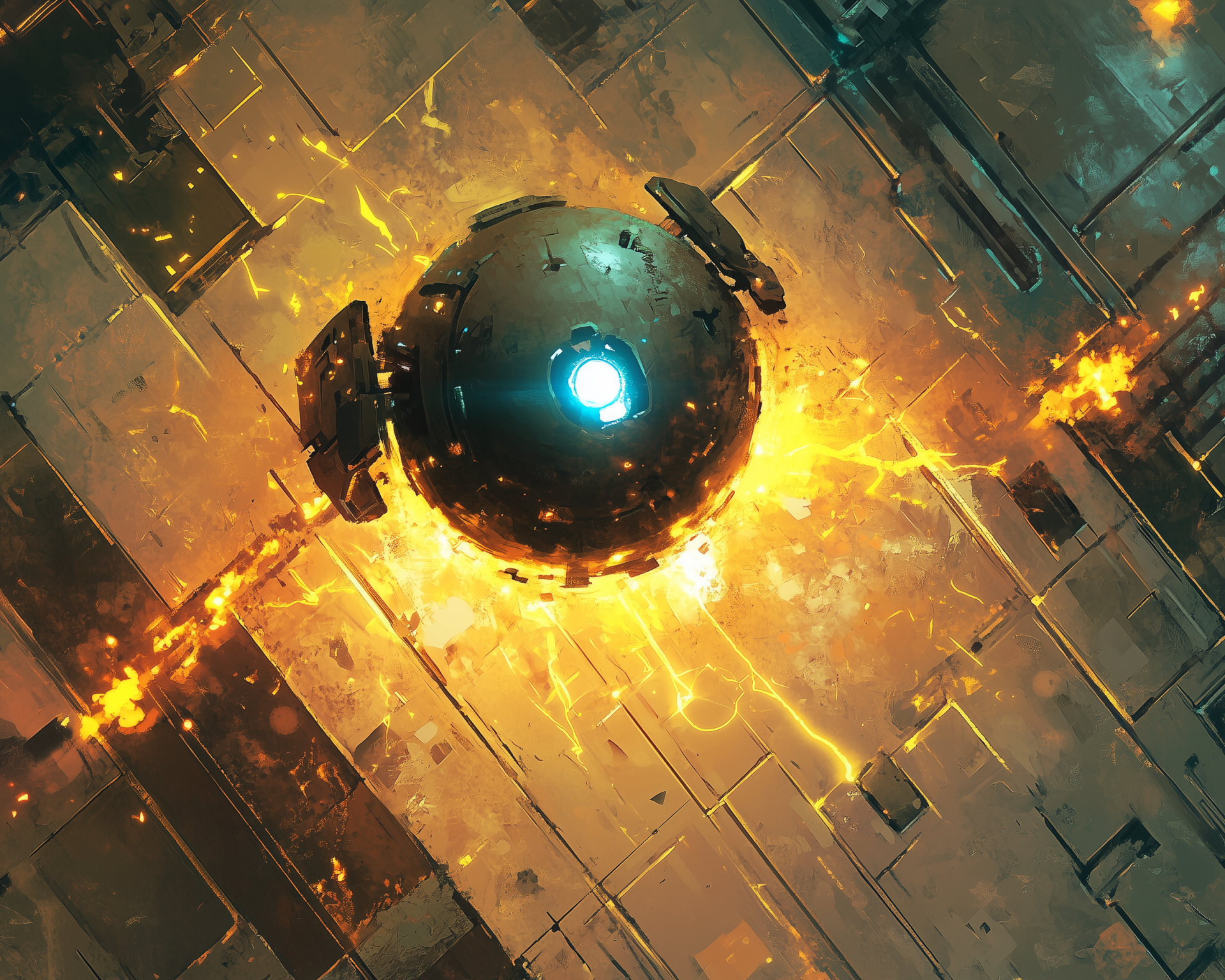 This illustration depicts a small, floating minion within a vibrant, cyberpunk-inspired setting. The minion features a spherical form, surrounded by neon colors and mystical elements that blend fantasy and futuristic aesthetics.