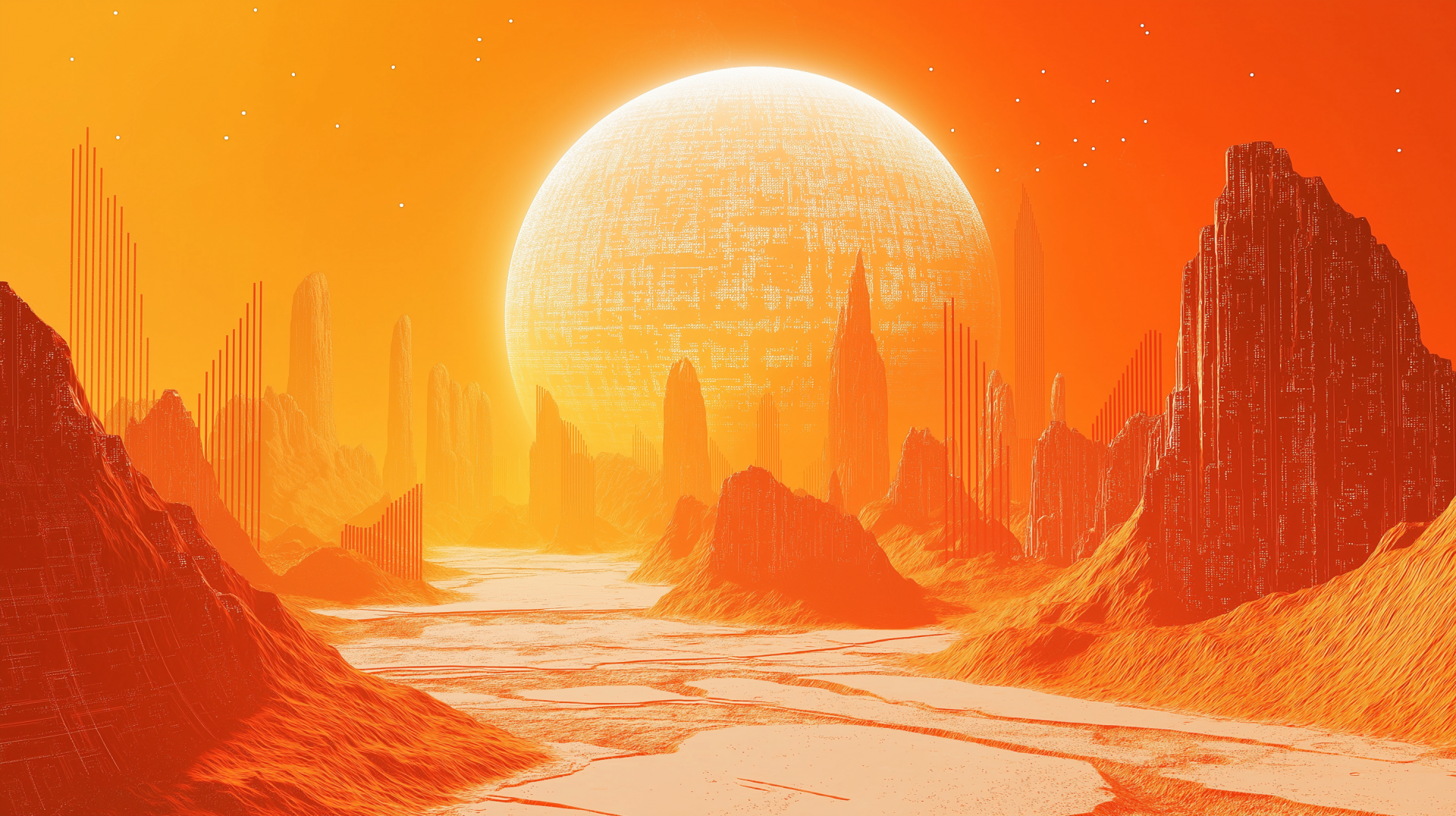 The image showcases a high contrast abstract environment with an orange color scheme. It features sharp geometric shapes and smooth gradients, creating a sense of depth and space.