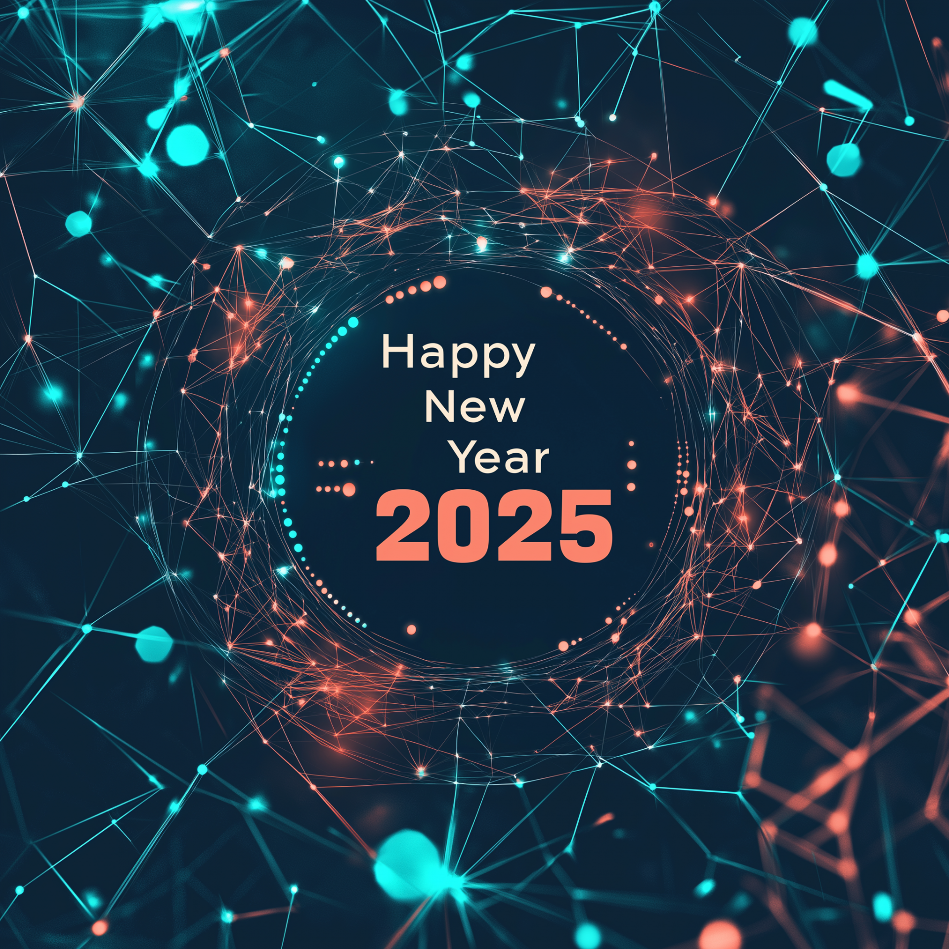 The image features a muted matte color background created in a watercolor style, giving it a soft and calming aesthetic. Boldly displayed in the center is the text 'Happy New Year 2025', embracing a theme of cybersecurity through its design elements.