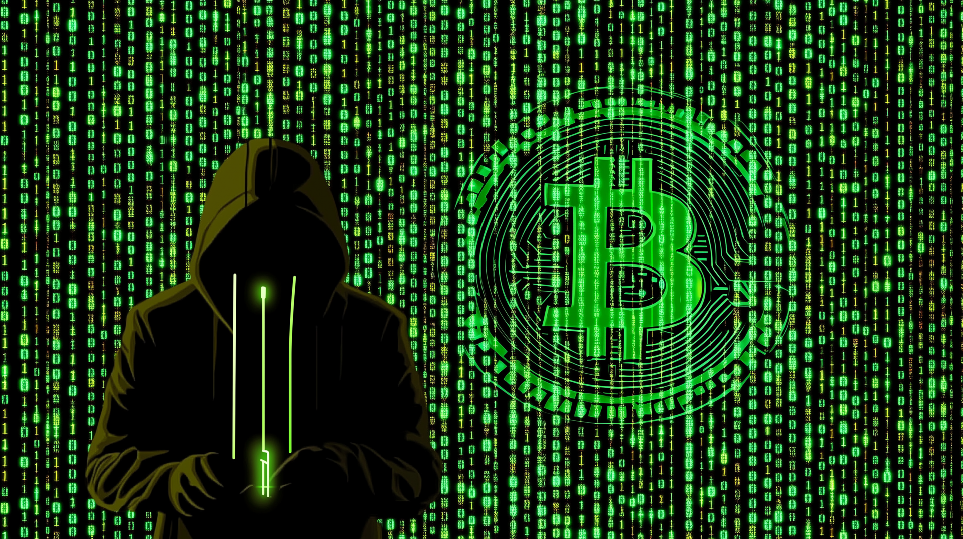 The image depicts a figure engaged with a computer, surrounded by visual representations of binary code and cryptocurrency symbols. This digital artwork conveys a sense of mystery and tension related to cybersecurity and data protection.