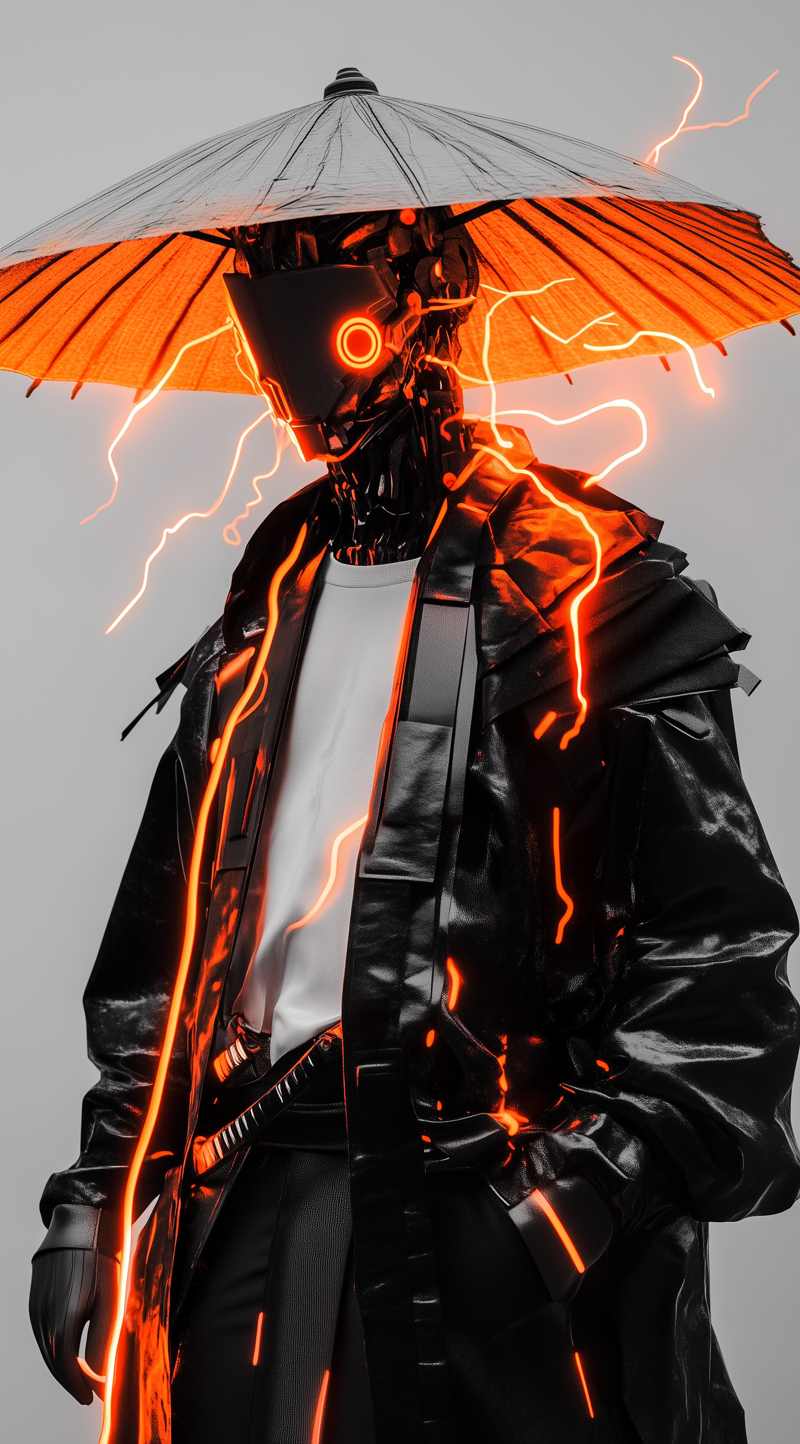 This illustration depicts a male cyborg dressed in traditional samurai attire, evoking a futuristic yet classic aesthetic. The vibrant colors and intricate details highlight the fusion of technology and ancient warrior culture.