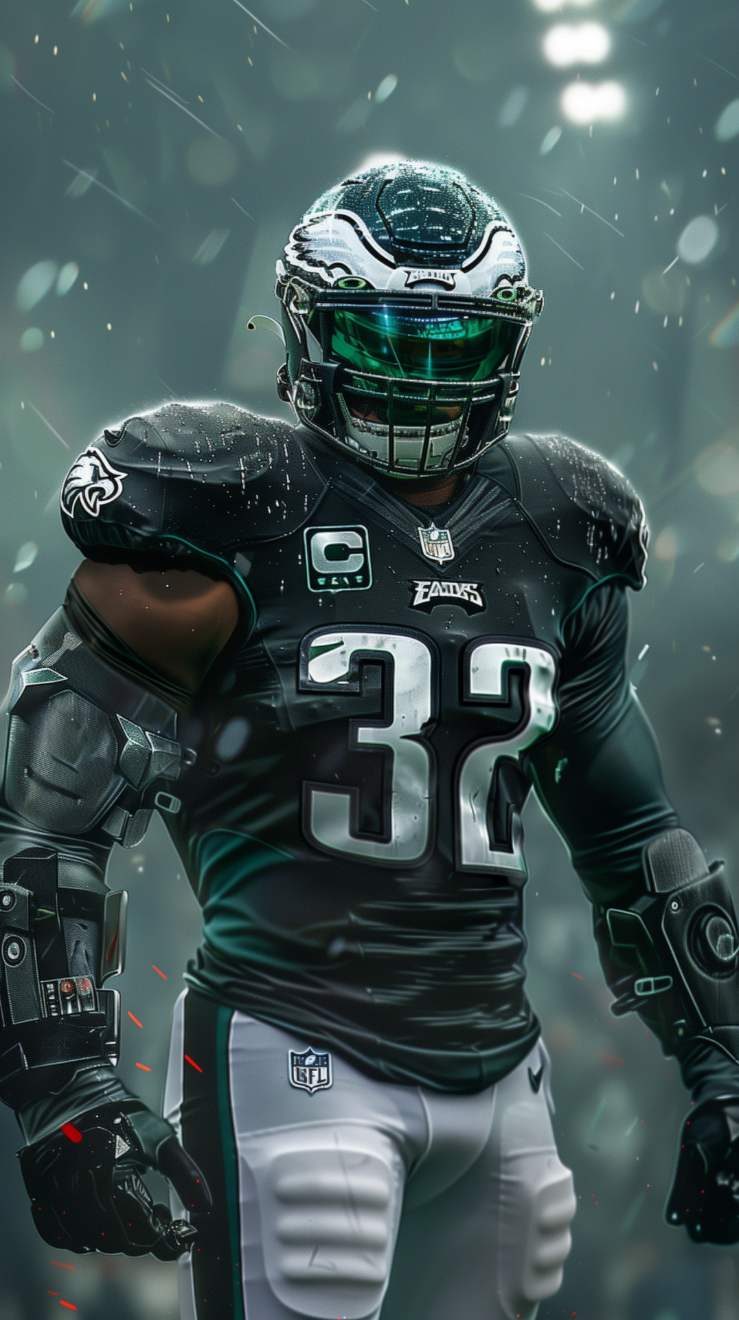 The illustration depicts a fierce and intimidating figure resembling a cyborg warrior, infused with a blend of elements from football and science fiction. The character features a football jersey, exuding a sense of power and strength, set against a dark and hellish background.