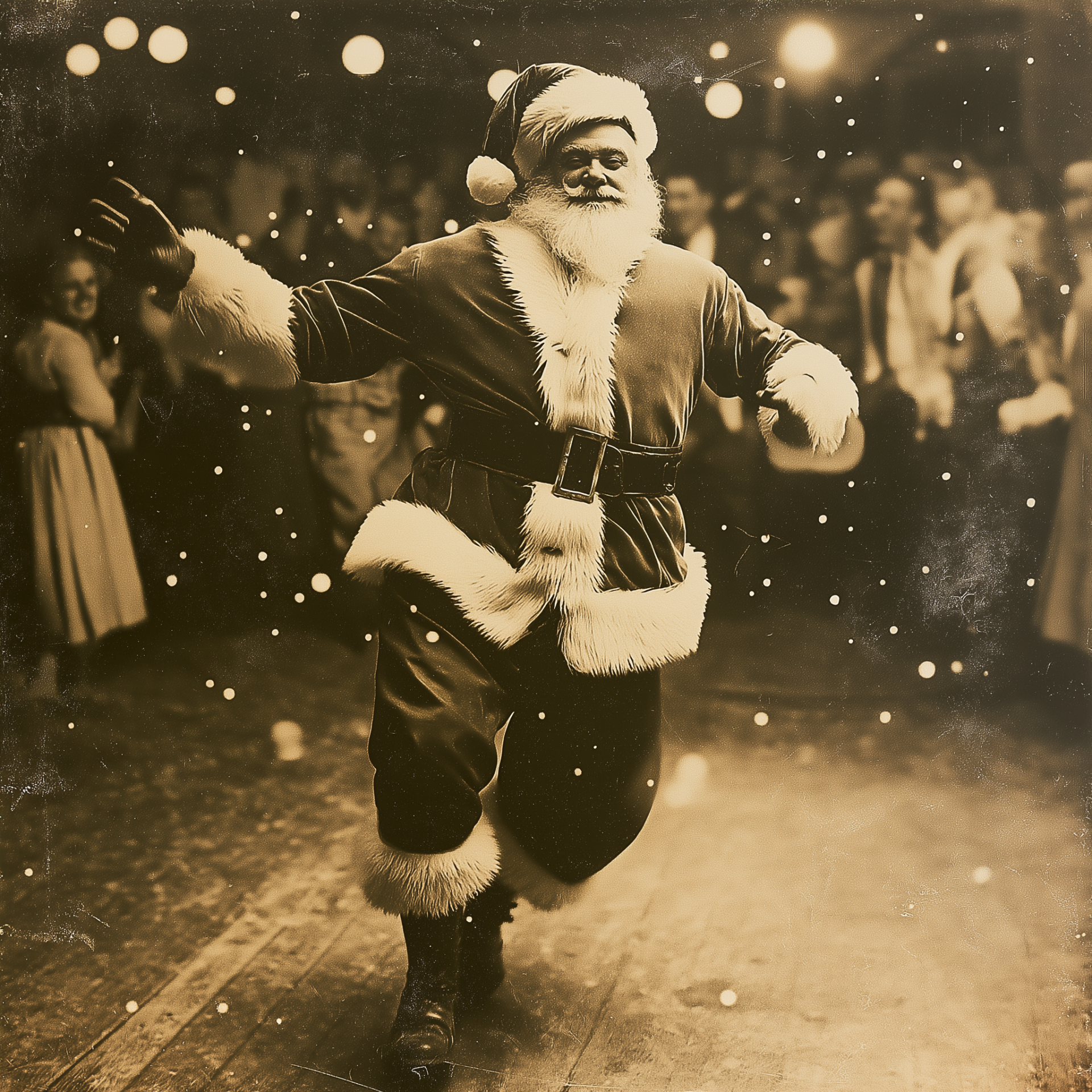 This image captures a vintage portrayal of Santa Claus joyfully dancing in a lively nightclub setting. The warm lighting and retro atmosphere create a nostalgic and festive mood.
