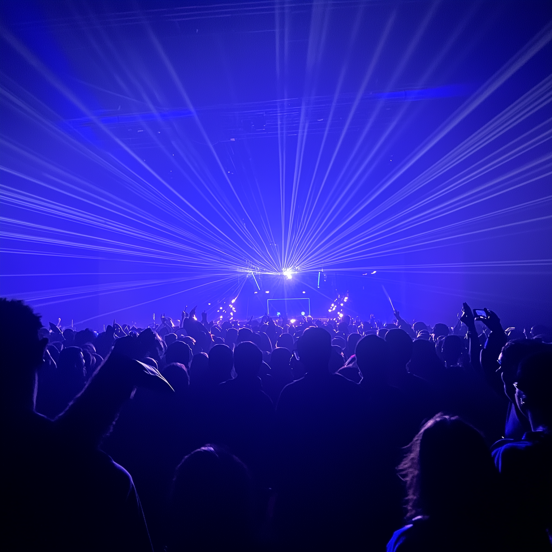 The image captures a packed live show from behind the crowd, illuminated by bright blue neon lights on stage. The atmosphere is electric, filled with rave vibes as the crowd basks in the glow of the lights.