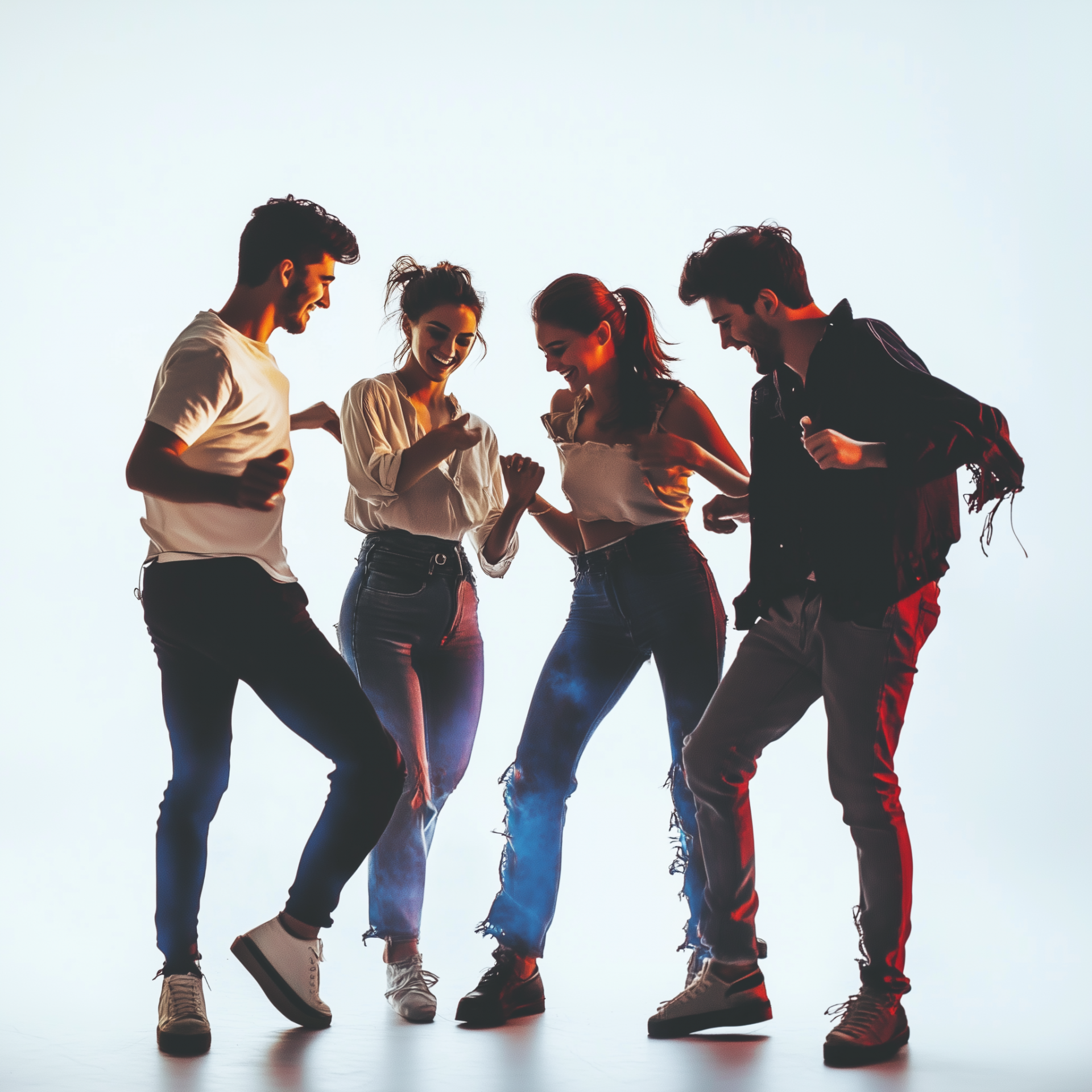 A dynamic scene captures a group of 25-year-olds joyfully dancing, facing each other with bright smiles. The absence of a background intensifies the focus on their happy expressions and lively movements.