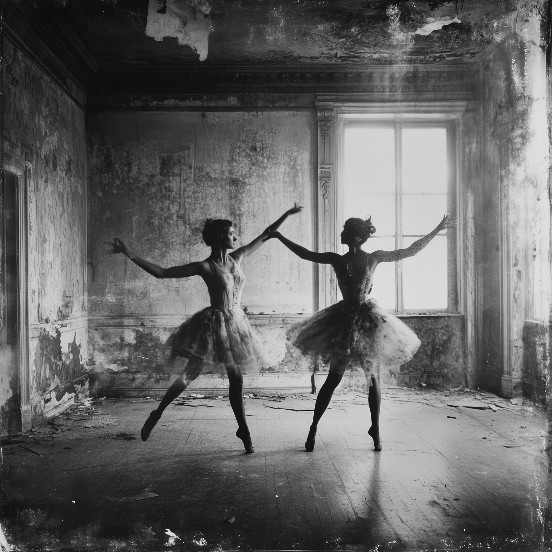 This striking black and white photograph captures two dancers gracefully moving in an eerie, abandoned ballroom. The contrast between the dancers and the desolate surroundings creates a haunting yet beautiful atmosphere.