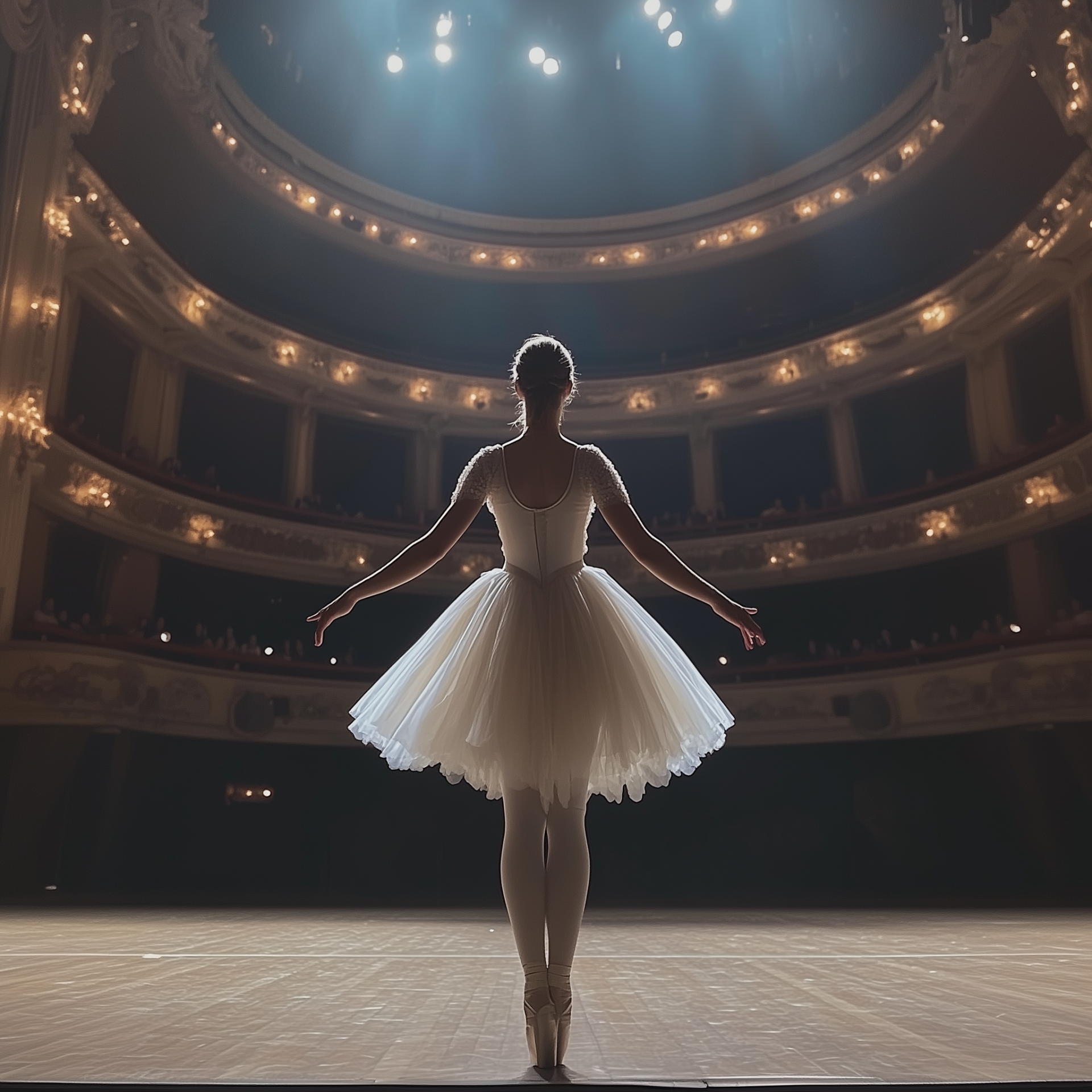 A graceful ballerina dressed in white captivates the audience as she performs on stage. The ambiance is filled with elegance, as the soft lighting enhances the beauty of her movements.