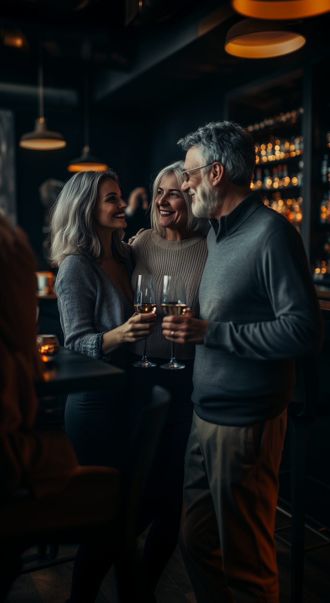 This image captures a happy middle-aged couple engaging with other stylish seniors in a dark, chic nightclub atmosphere. The setting features high-top bar tables and a moody ambiance, creating an inviting and free-spirited vibe.