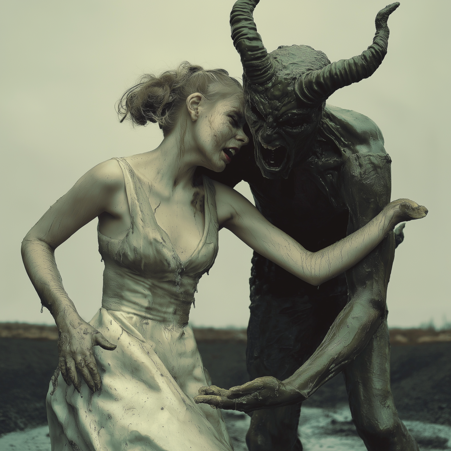 The image captures a surreal and vibrant dance scene under a dramatic sky. A tired woman dressed as Venus moves alongside a thin devil, their expressive poses creating a chaotic yet energetic atmosphere.