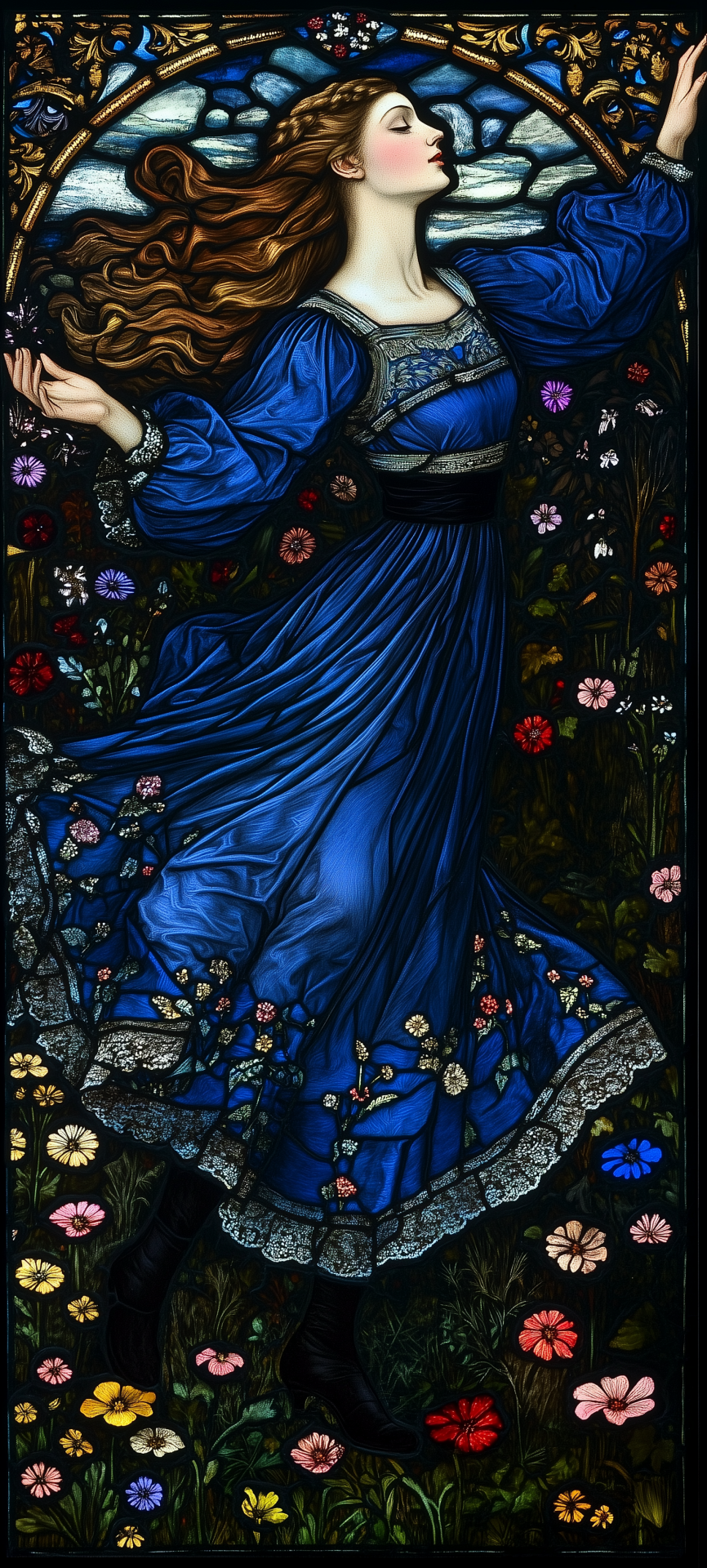 The illustration depicts a large, beautiful woman in a royal blue dress, gracefully dancing amidst vibrant flowers. Her flowy skirt and frilly lace petticoat create a sense of movement, while the use of stained glass elements adds a beautiful, luminous quality to the scene.