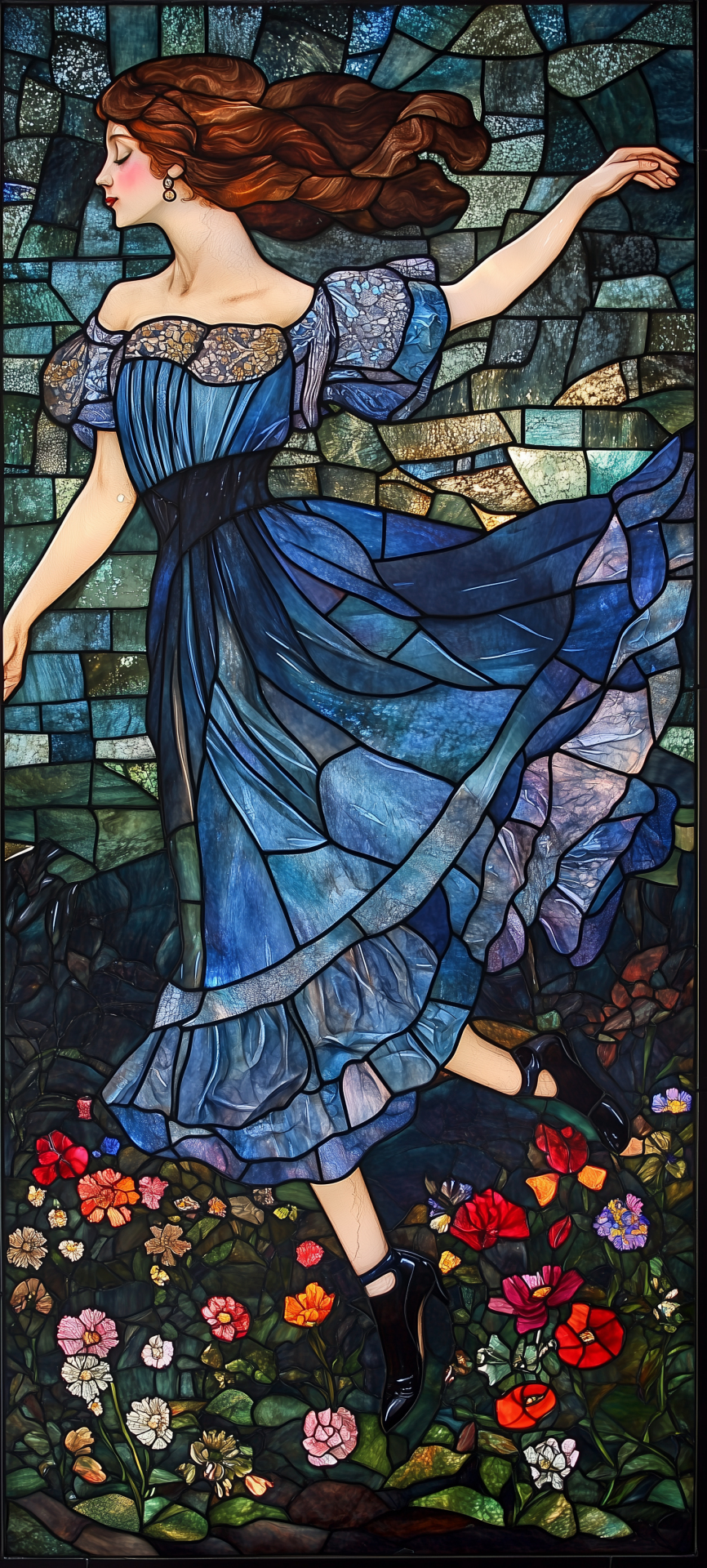 This illustration features a large, beautiful woman dressed in a royal blue cotton gown, twirling gracefully amidst vibrant flowers. The stained glass style adds a rich texture, highlighting the flowy, frilly details of her skirt and the delicate lace petticoat underneath.