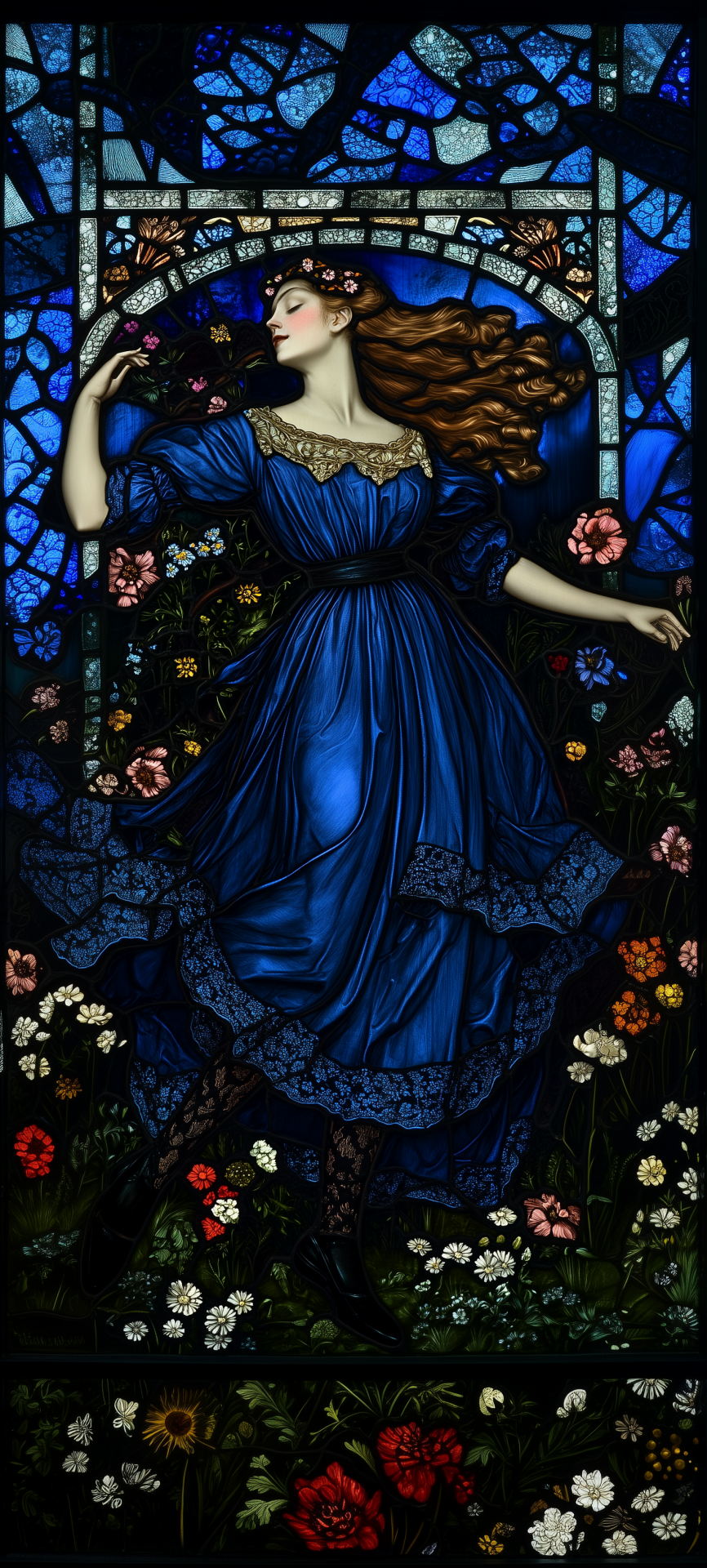 The image depicts a large, beautiful woman dressed in a royal blue cotton dress as she dances among colorful flowers. The stained glass style creates a vibrant play of light, enhancing the flowy and frilly details of her full skirt and lace petticoat.
