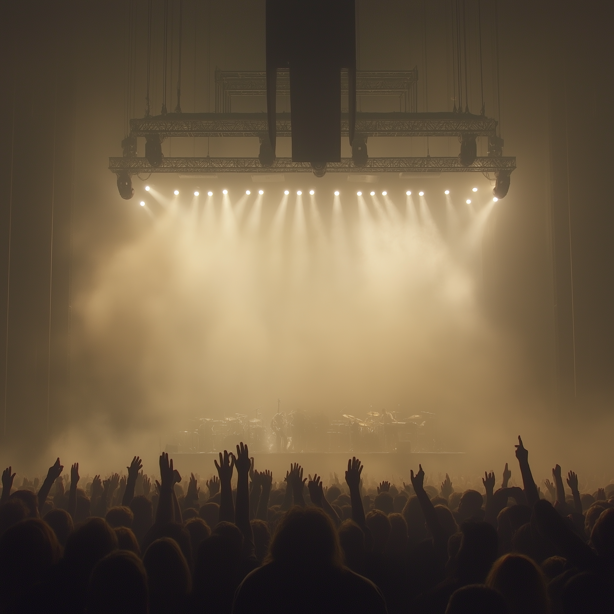 This image captures the silhouettes of a vibrant crowd at a concert, with their hands raised in excitement and movement. The bright stage lights create a striking contrast, outlining the enjoyment and energy of the enthusiastic audience.