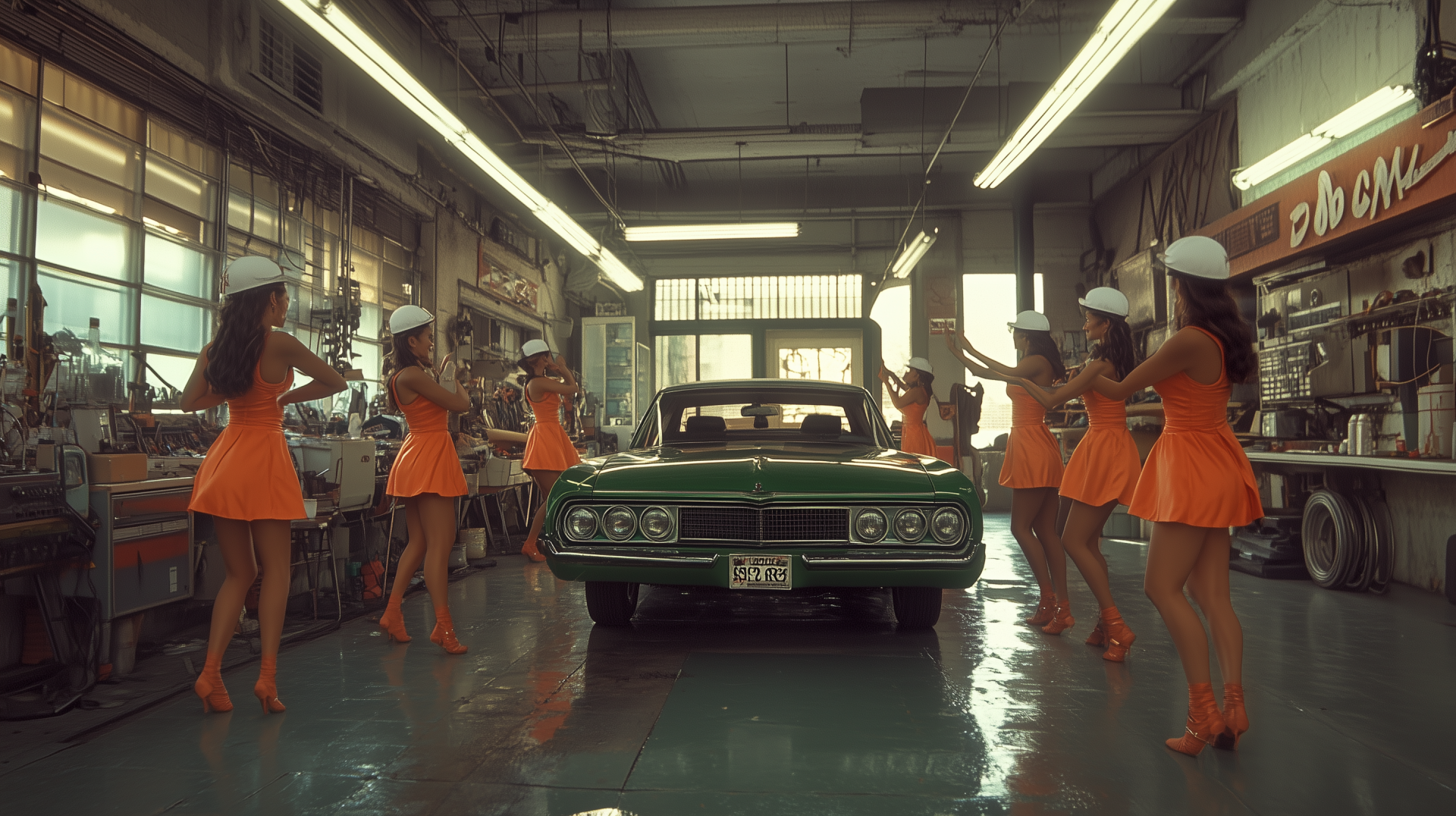 The image captures a lively scene from a 1970s car repair shop in Mexico City, featuring female dancers in vibrant orange miniskirts and white caps. In the center, a classic green car adds a nostalgic touch to the energetic atmosphere filled with movement and color.