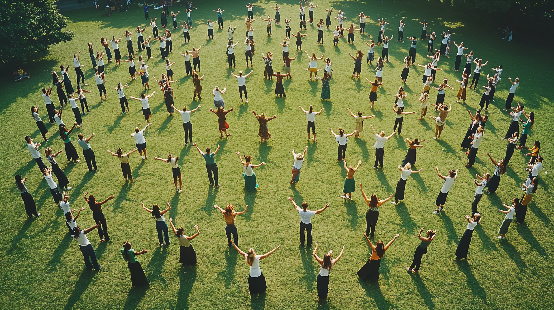 This aerial view captures a lively flashmob taking place on lush green grass, creating a wave of movement and energy. The gold and green tones give the scene a vibrant and warm feeling, perfectly highlighting the joy of the gathering.