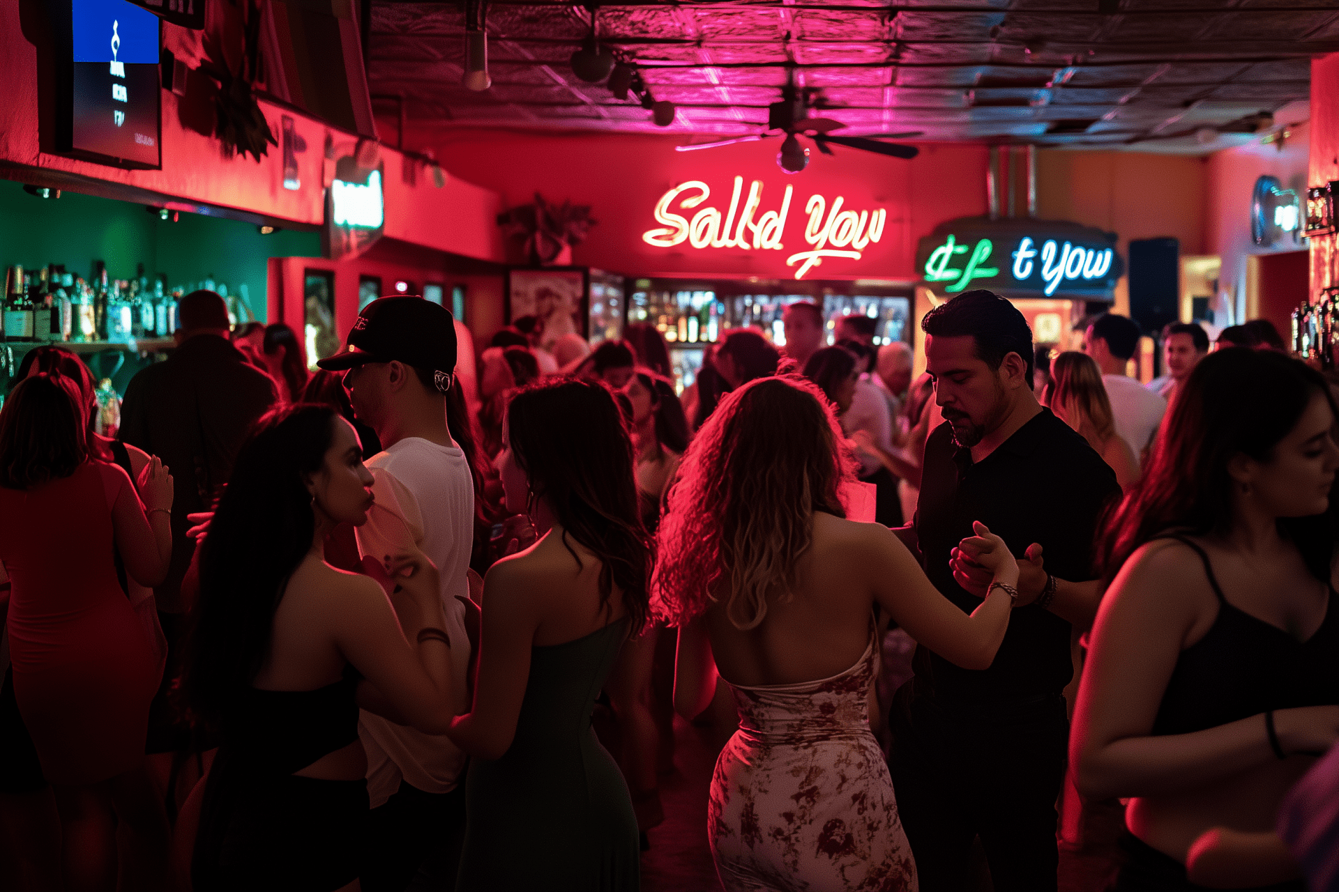 The image captures a lively atmosphere in a Latin bar filled with diverse individuals dancing salsa. Colorful neon lights illuminate the scene, creating an energetic and vibrant feeling.