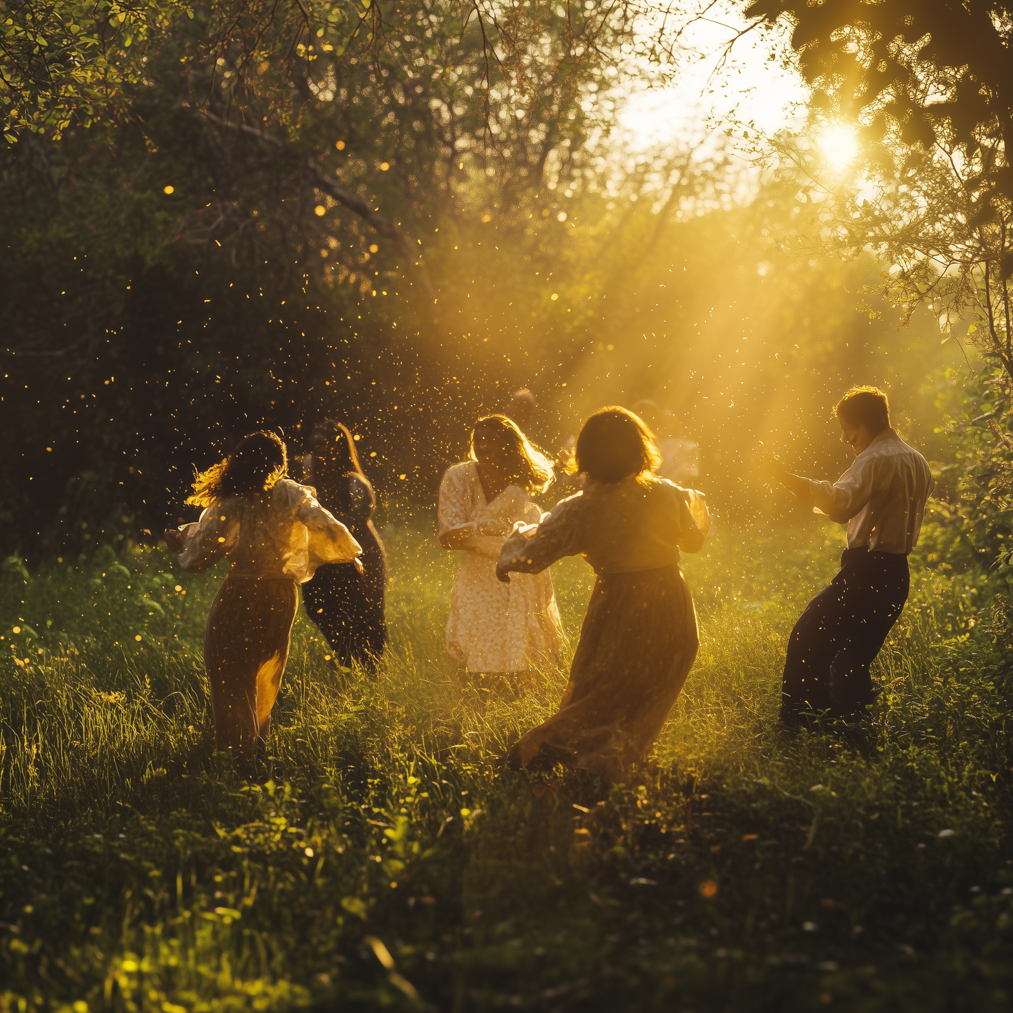 A group of people joyfully dances in a vibrant, lush green field, surrounded by the warm hues of autumn foliage. The image captures a dynamic and lively atmosphere, enhanced by long shadows and rich colors under the bright sunlight.