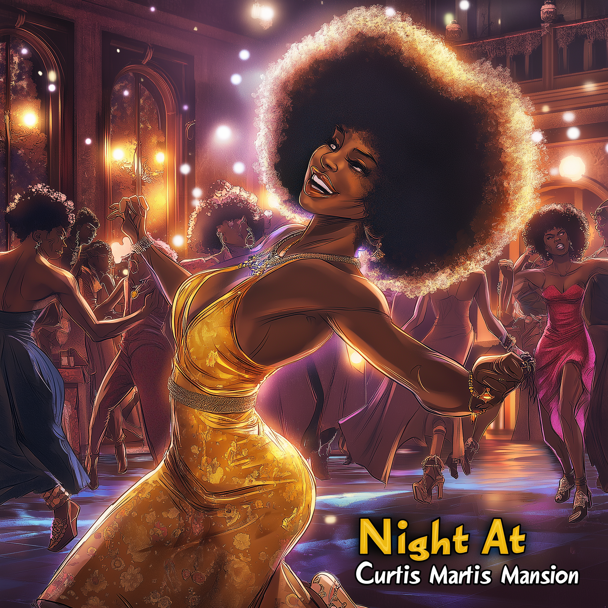 The image captures a vibrant disco scene filled with black dancers showcasing their energetic moves on the dance floor. Colorful lights illuminate the atmosphere, creating a festive vibe with a beautiful woman prominently positioned in the front.