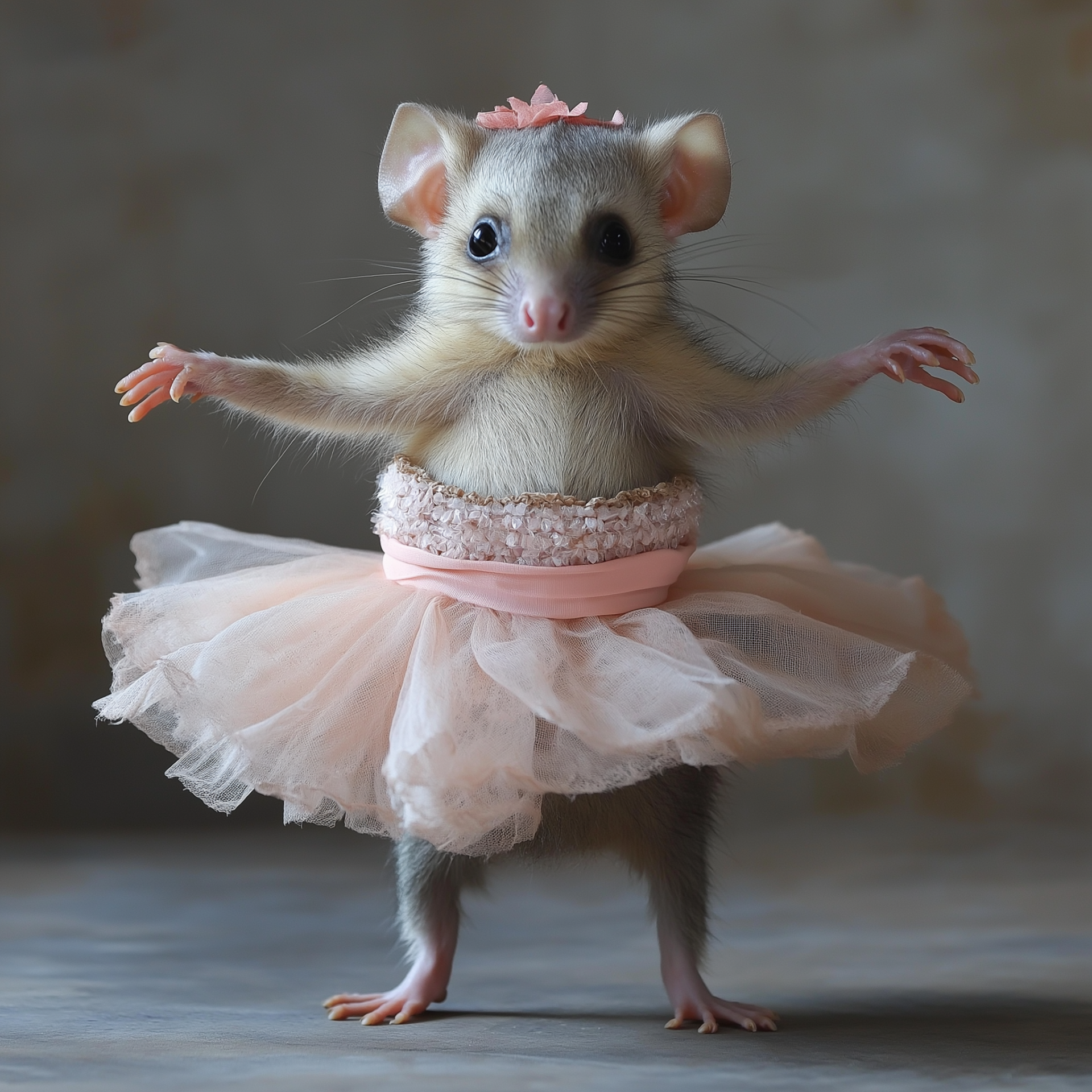 The image features a whimsical portrayal of a possum dressed in a vibrant ballerina costume, elegantly posed as if dancing. The scene captures a playful and imaginative atmosphere, blending the charm of ballet with the quirky nature of the animal.