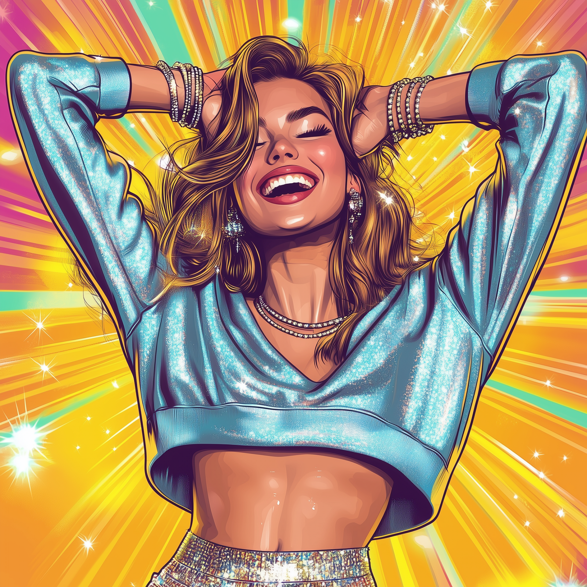 This illustration captures the exuberance of a girl dancing joyfully with her arms raised. The vibrant colors and sparkling details create a lively atmosphere, embodying the spirit of celebration.