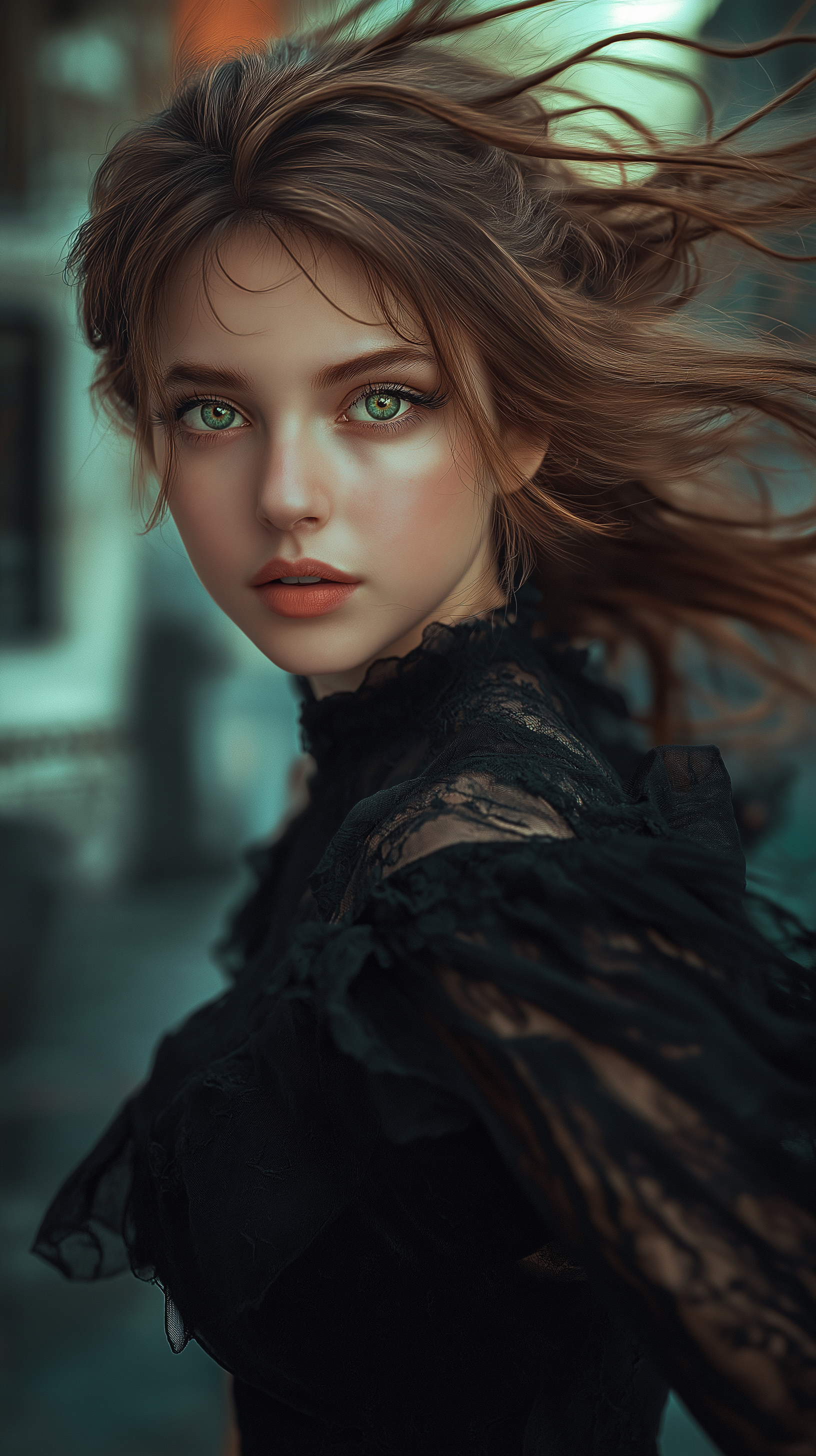 This photorealistic image captures a beautiful young woman dancing gracefully on a street, embodying an air of mystery and allure. Her striking green eyes and witch-like attire enhance her unusual beauty, while the wind adds a dynamic energy to the scene.