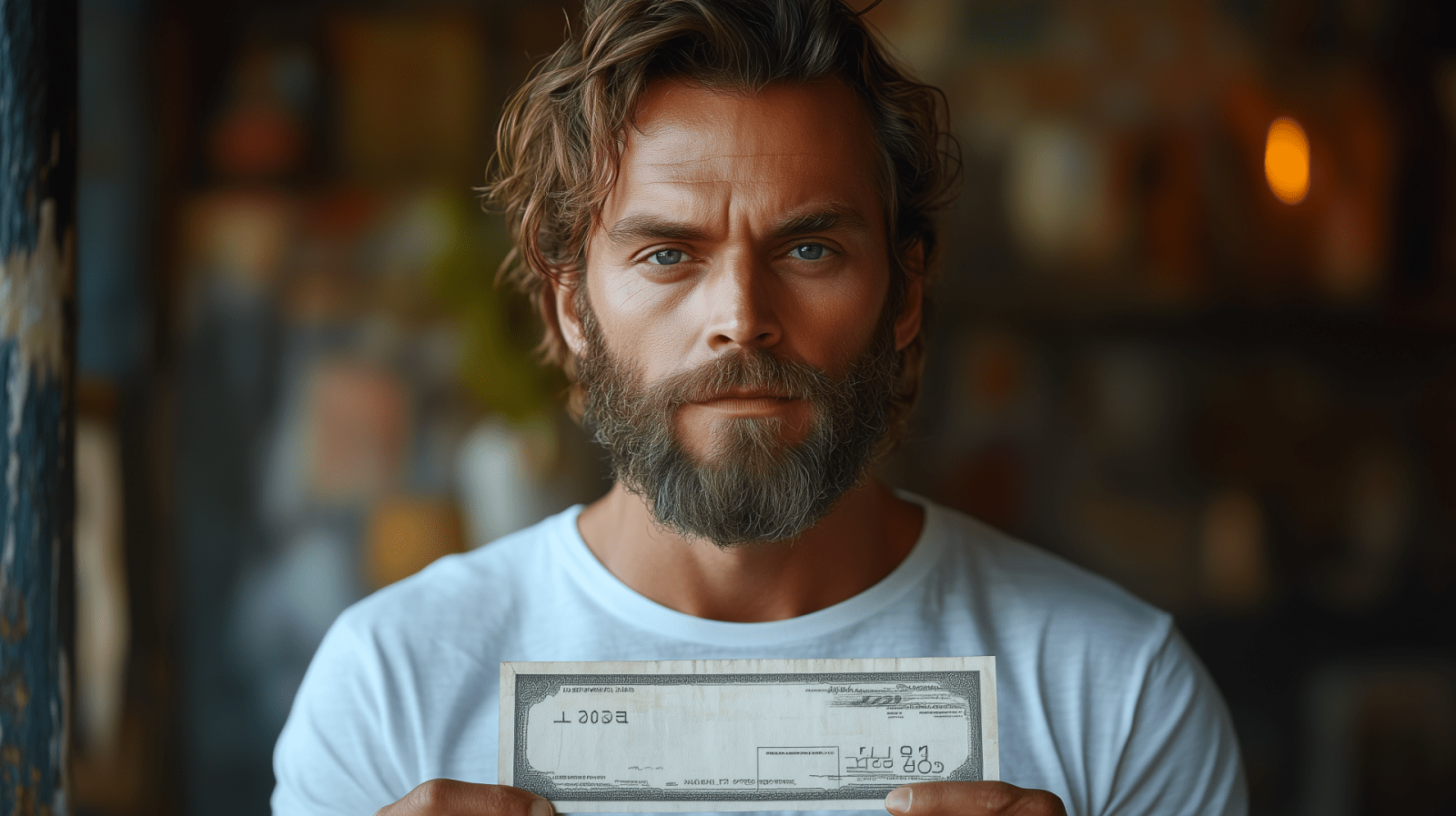 A forty-year-old man with a stern expression exudes an air of danger. He is holding a large lottery check and dressed in a simple white t-shirt, adding to the tension of the scene.