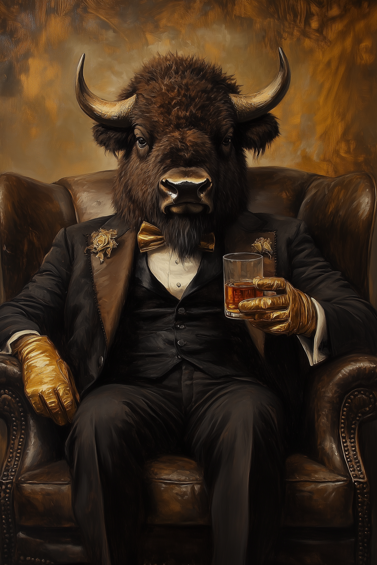 This old oil painting features a distinguished bison dressed in formal attire, complete with a black tie and driving gloves. The bison is seated in an elegant leather armchair, exuding a sense of sophistication while holding a tumbler of scotch.