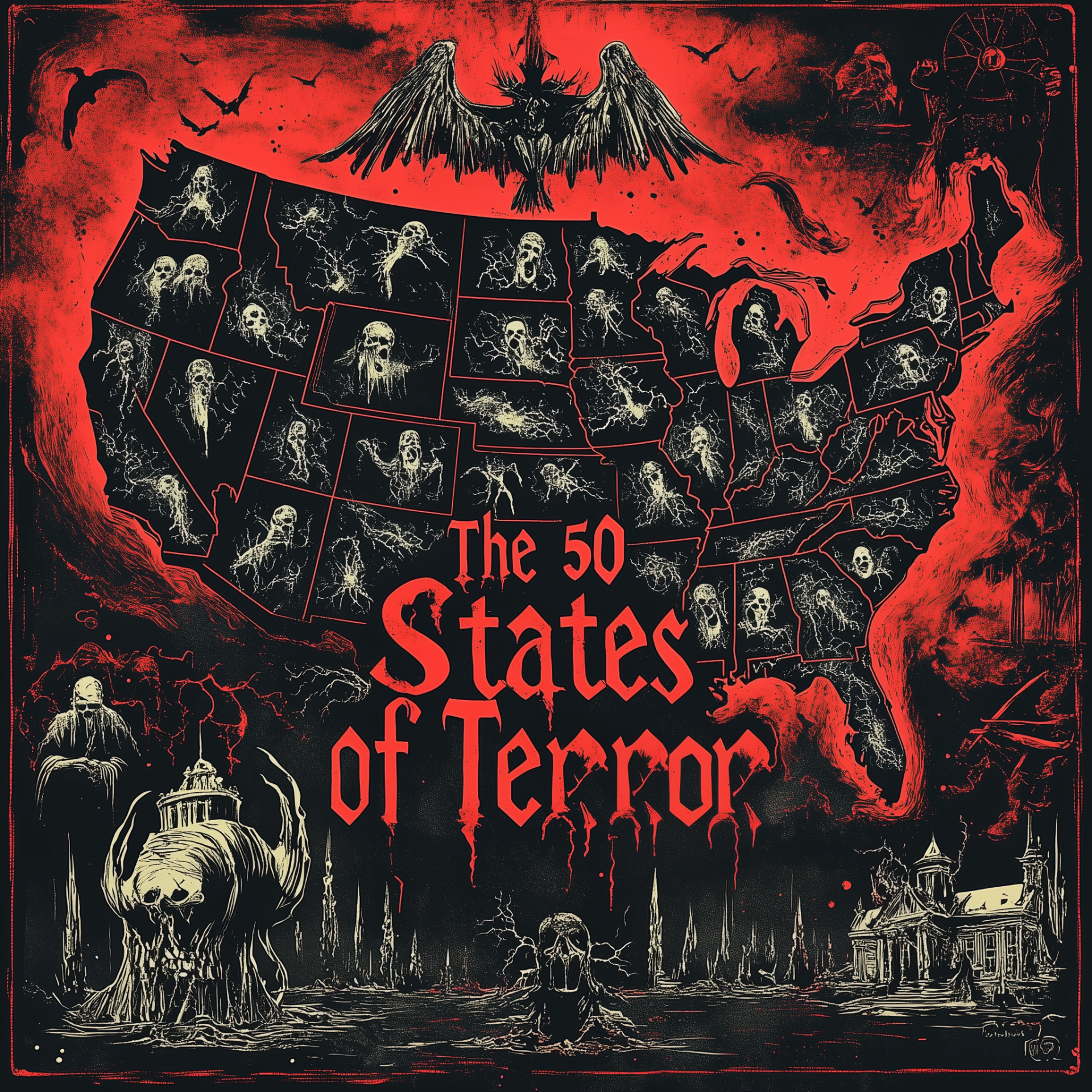 This illustration features a horror-themed map of the United States, showcasing state subdivisions amid a haunting red and black color palette. Ghostly figures and a detailed death angel add a chilling atmosphere, centered around the prominent title.