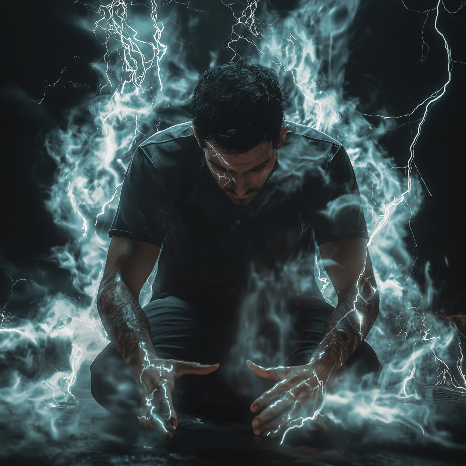 A shirtless man kneels as dark smoke infused with lightning energy courses through his body. His veins turn a sinister black and his eyes reflect a haunting transformation, capturing a moment of raw intensity and surrealism.
