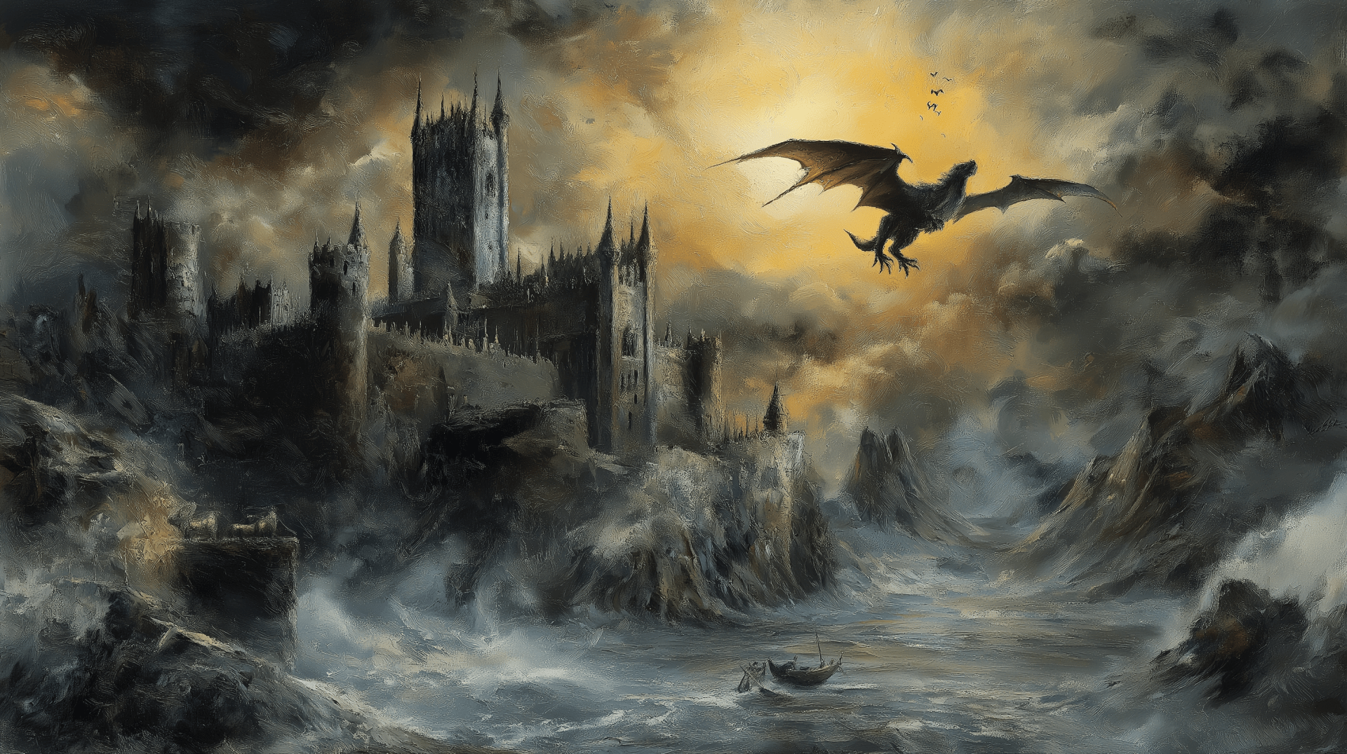 The artwork depicts a dramatic and stormy scene, featuring a medieval castle looming under dark clouds. A fierce dragon soars above, adding an element of fantasy and tension to the vibrant oil painting.