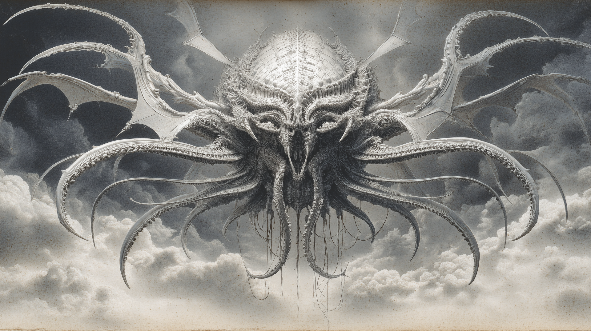 This illustration portrays a surreal scene featuring a squid-like creature engaged in a macabre dance under an otherworldly setting. The intricate details and dark themes evoke a sense of mystery and fantasy, capturing a unique blend of horror and beauty.