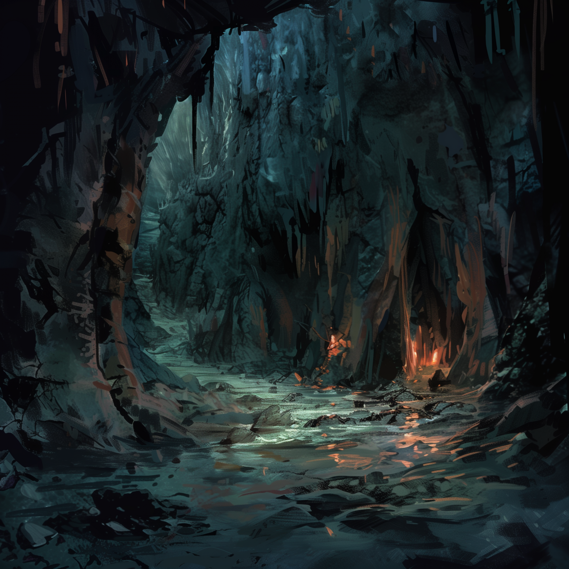 The image depicts a foreboding dark cave, filled with shadows and an eerie ambiance that evokes a sense of danger. Intricate details and a mystical color palette bring this Dungeons and Dragons-inspired environment to life.