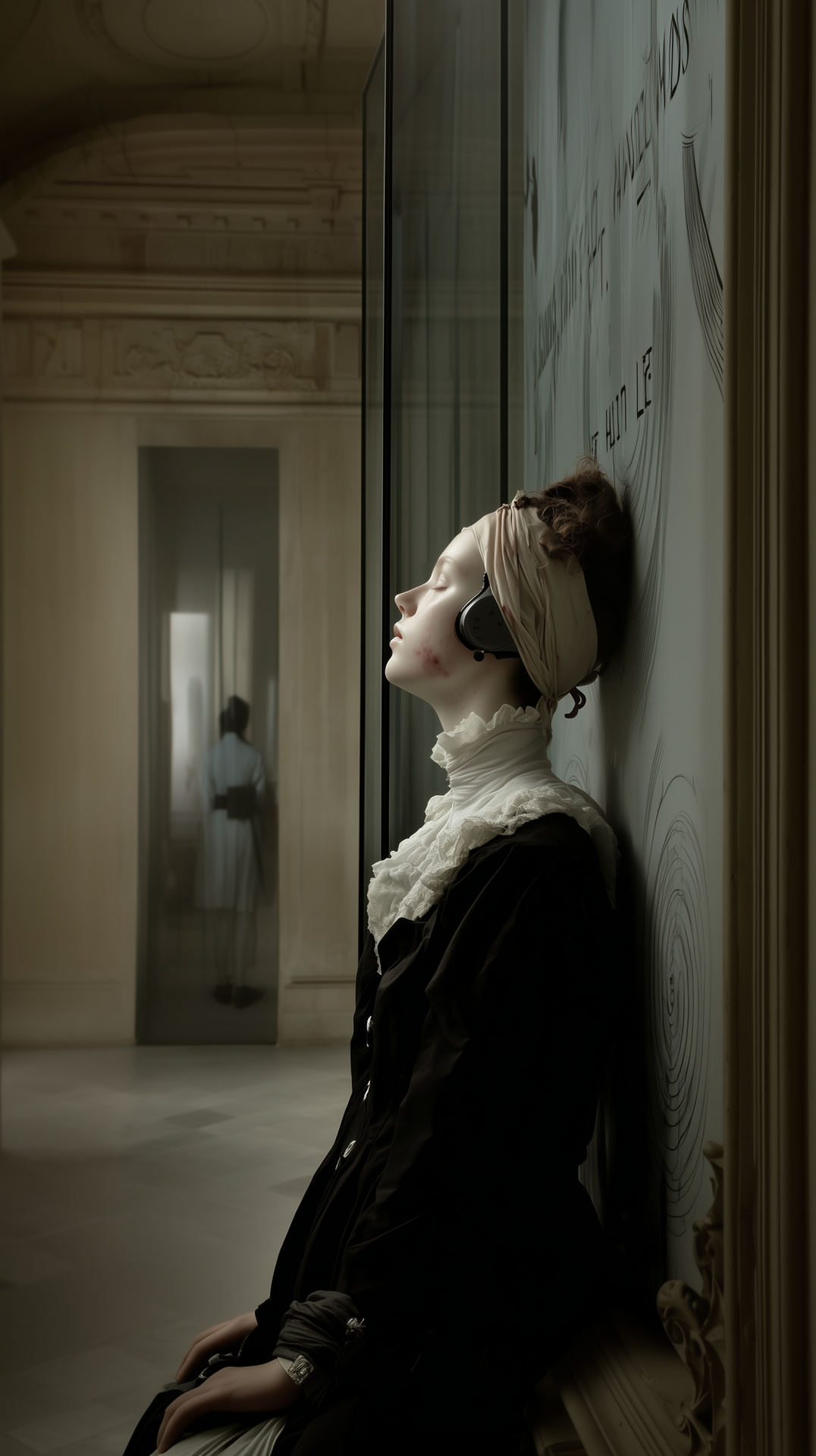 The image depicts a cold, sterile room filled with rows of pods housing unconscious individuals. Scientists in white coats silently work with machines, creating an unsettling atmosphere of lost identity and manipulated memories.