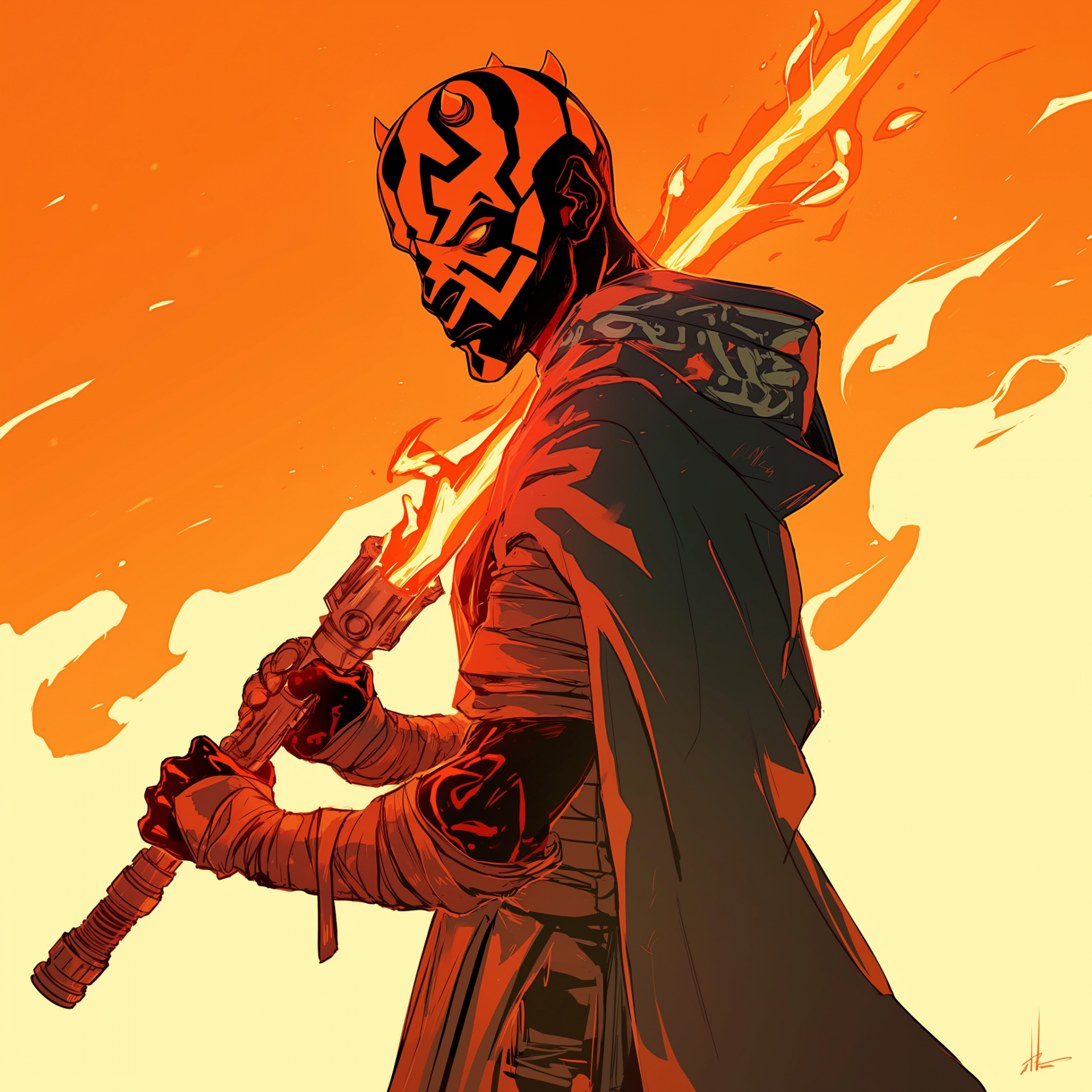 This illustration features a Zabrak character with a striking deep orange complexion adorned with bold black facial tattoos. The character exudes a fierce and powerful aura, making the vibrant colors and intricate details stand out.