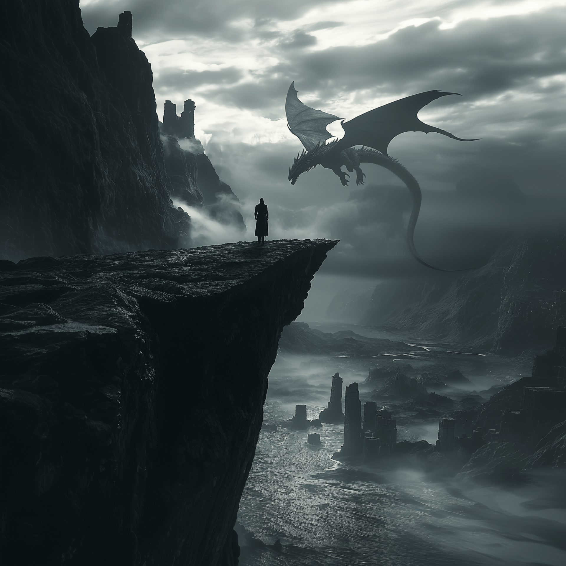 The image captures a dramatic scene with a Dovahkiin character standing on a cliff, overlooking ancient ruins that are scattered below. A menacing dragon looms in the background, enhancing the dark fantasy and gothic horror atmosphere.