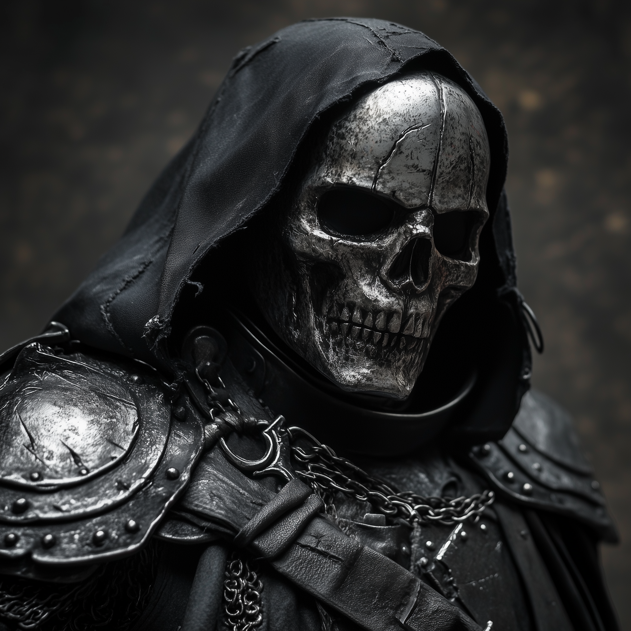 This illustration features a towering death knight standing tall at six feet, five inches. Clad in imposing plate armor and a black hooded cloak, the helmet resembles a menacing human skull, enhancing the dark and eerie atmosphere of the image.