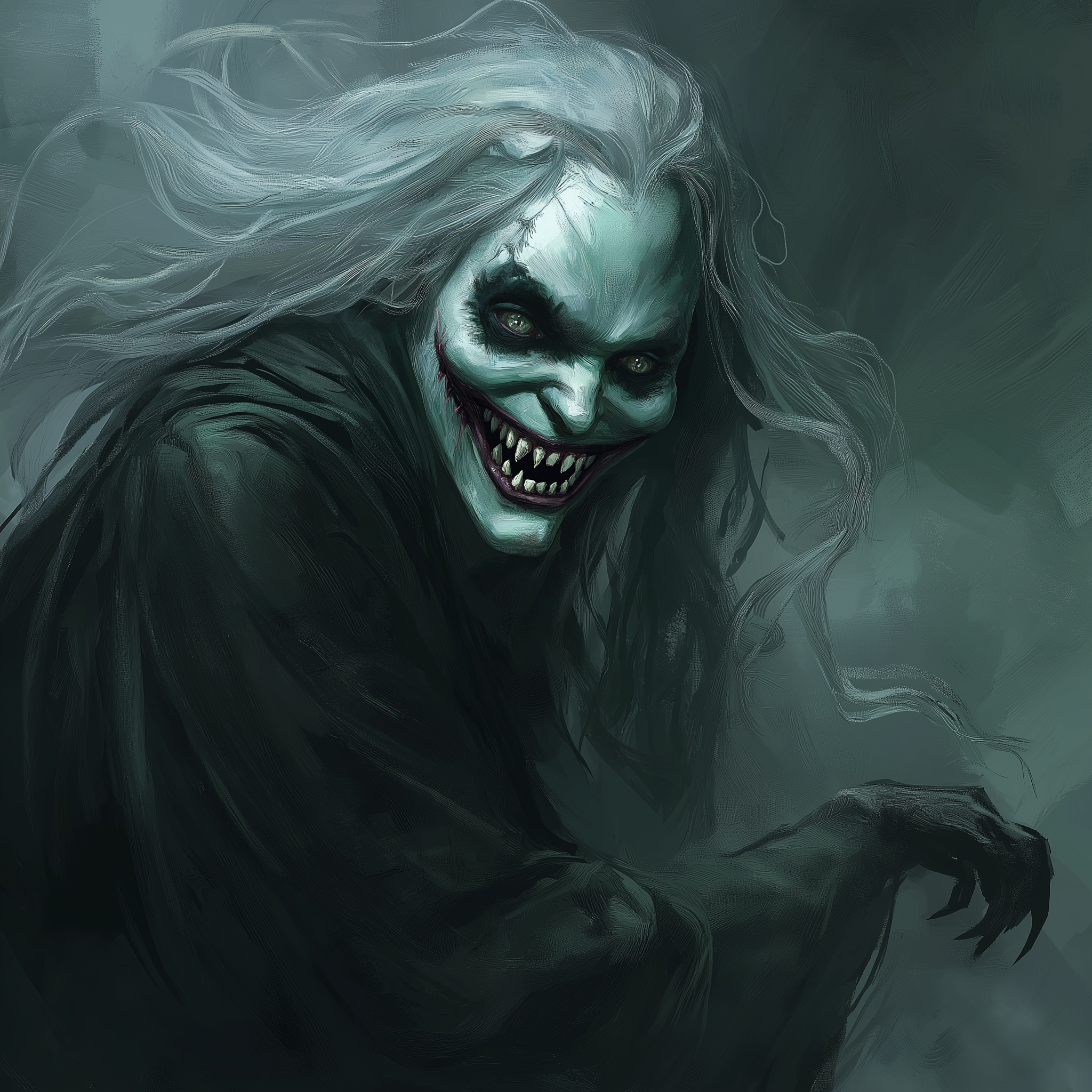 The image features a menacing hag with green and grey skin, her big joker-style smile revealing sharp shark-like teeth. Draped in a dark cloak, she lunges forward with a long clawed hand, set against a dramatic gothic backdrop with deep contrasts in lighting.