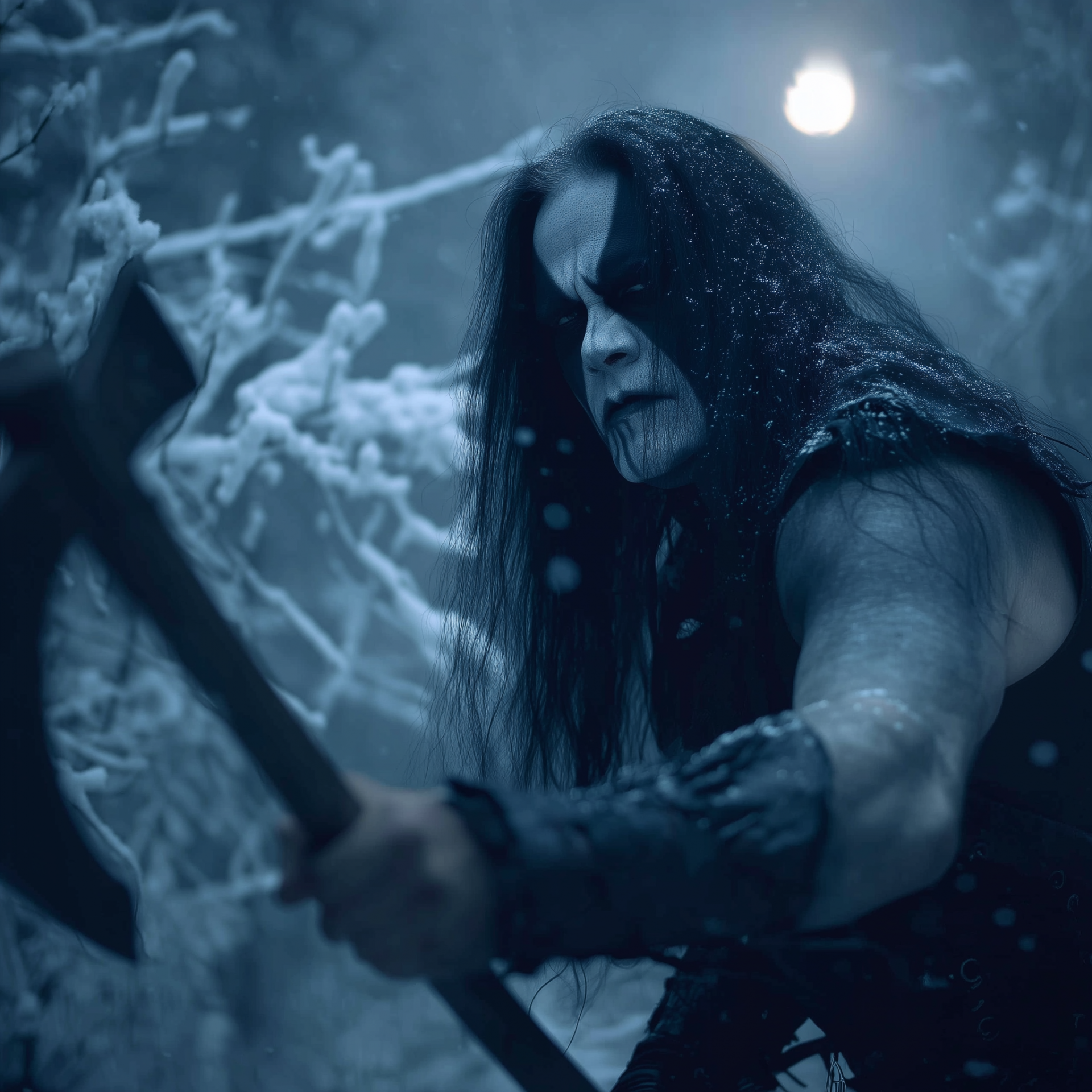 The image portrays a figure with long black hair and striking pale skin, wielding a massive axe. Set against a dark winter forest clearing illuminated by a full moon, it evokes a sense of mystery and power.